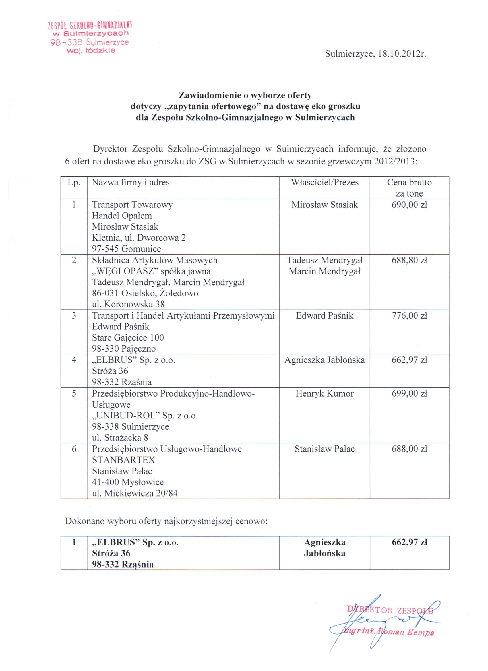 Zawiadomienie o wyborze oferty: dostawa węgla kamiennego - eko groszku dla Zespołu Szkolno-Gimnazjalnego w Sulmierzycach