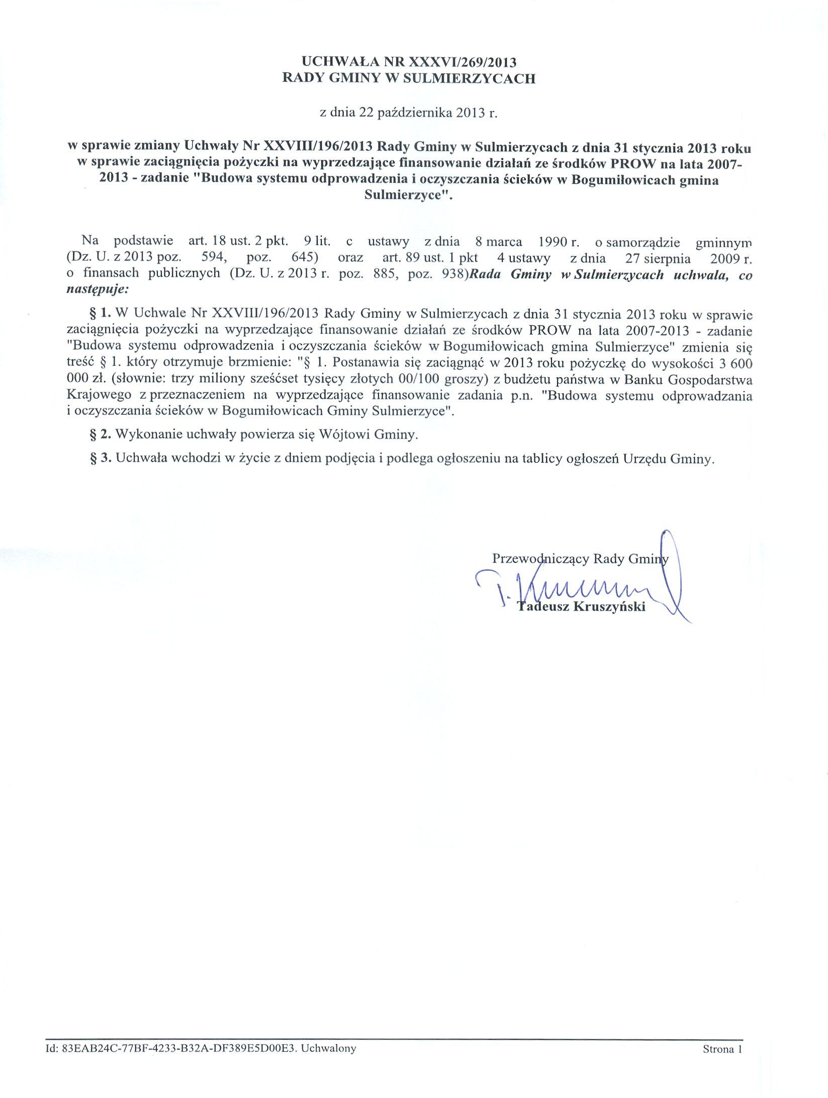 Uchwała Nr XXXVI/269/2013 z dnia 22.10.2013 r. w sprawie zmiany Uchwały Nr XXVIII/196/2013 Rady Gminy w Sulmierzycach z dnia 31 stycznia 2013 roku w sprawie zaciągnięcia pożyczki na wyprzedzjące finansowanie działań ze środków PROW na lata 2007-