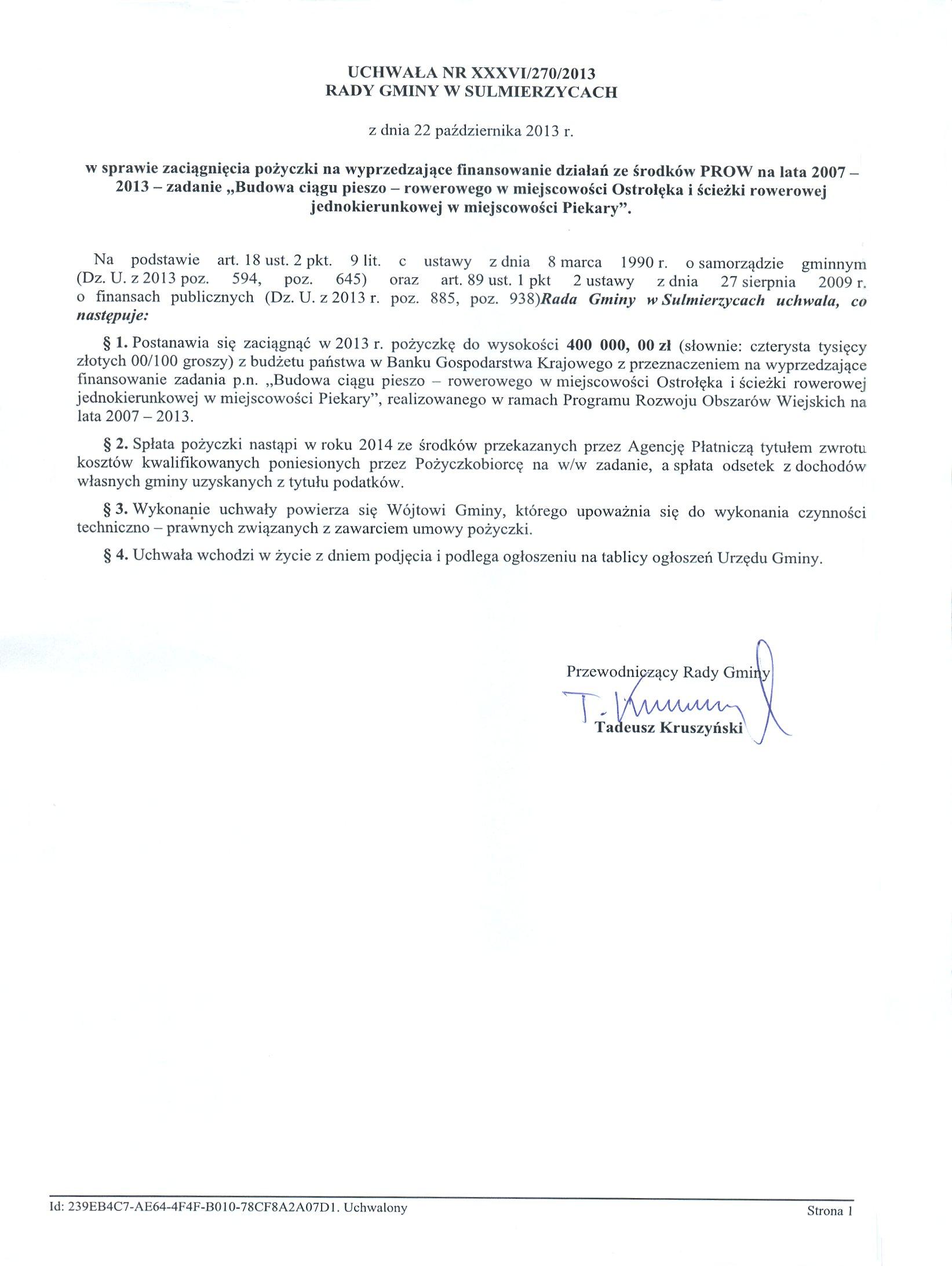 Uchwała Nr XXXVI/270/2013 z dnia 22/10.2013 r. w sprawie zaciągnięcia pożyczki na wyprzedzające finansowanie działań ze środków PROW na lata 2007-2013 - zadanie "Budowa ciągu pieszo - rowerowego w miejscowości Ostrołęka i ścieżki rowerowej