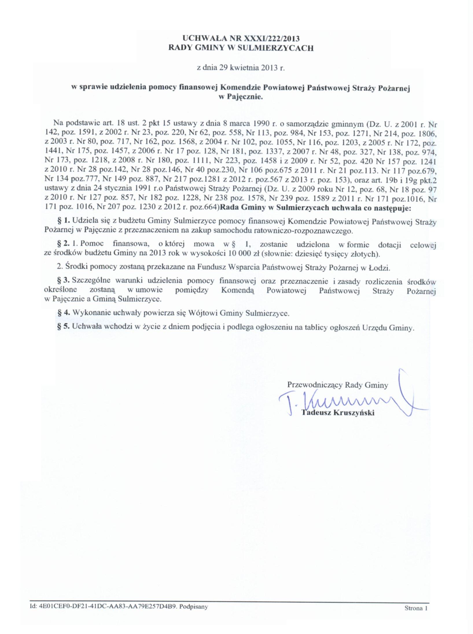 Uchwała Nr XXXI/222/2013 z dnia 29.04.2013 r. w sprawie udzielenia pomocy finansowej Komendzie Powiatowej Państwowej Straży Pożarnej w Pajęcznie