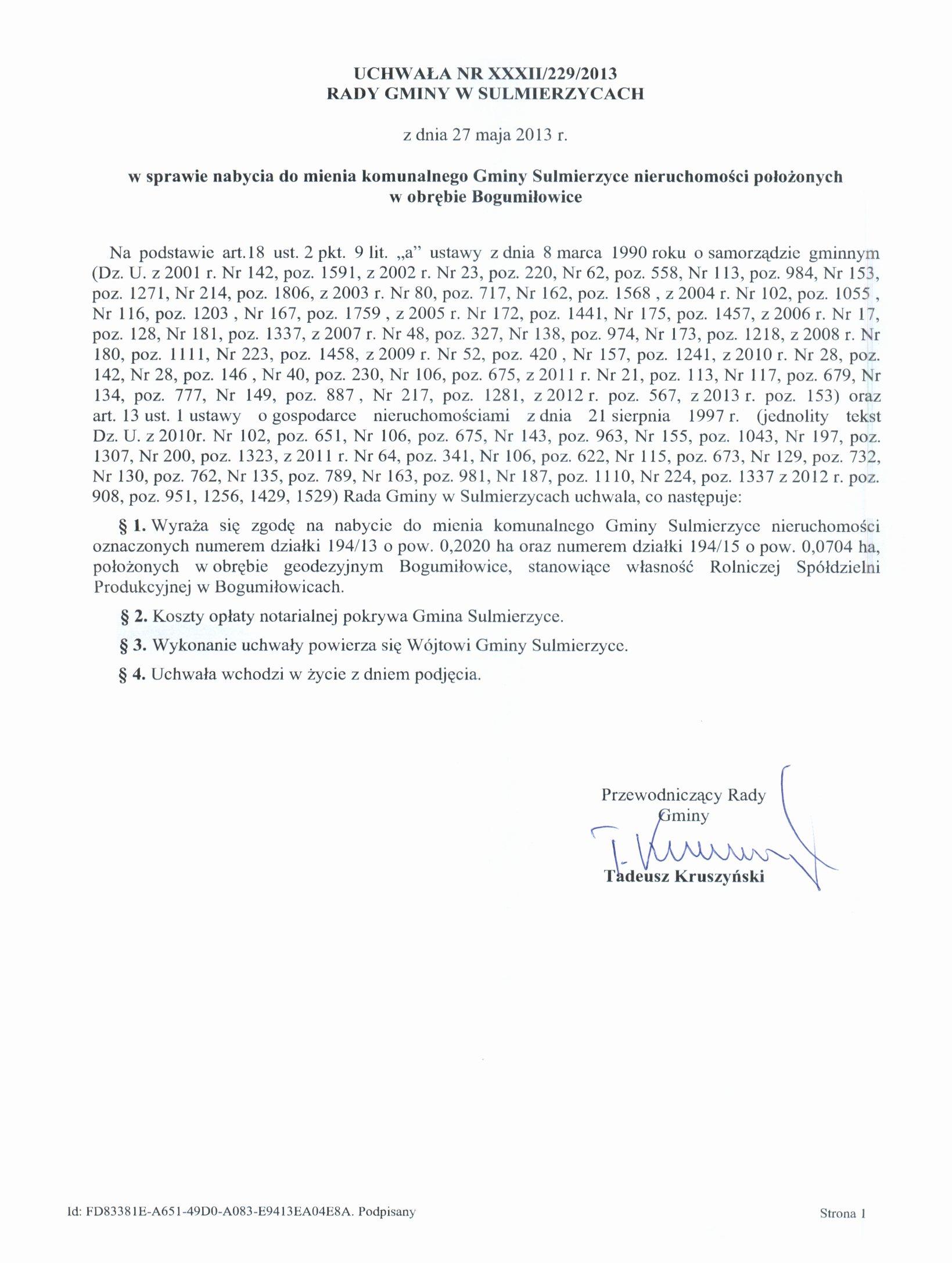 Uchwała Nr XXXII/229/2013 z dnia 27.05.2013 r. w sprawie nabycia do mienia komunalnego Gminy Sulmierzyce nieruchomości położonych w obrębie Bogumiłowice