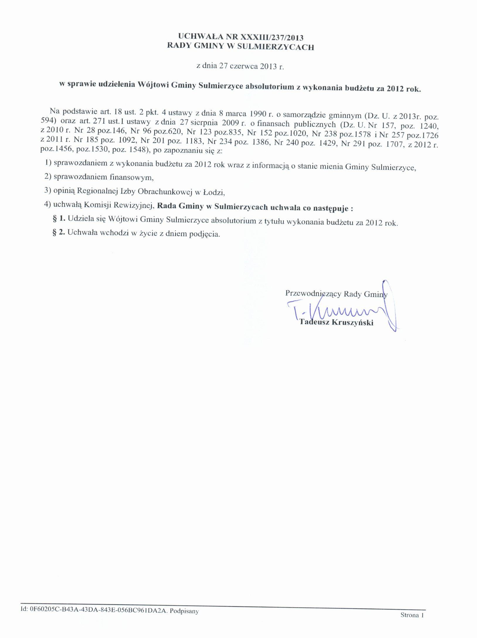 uchwała Nr XXXIII/237/2013 z dnia 27.06.2013 r. w sprawie udzielenia Wójtowi Gminy Sulmierzyce absolutorium z wykonania budżetu za 2012 rok