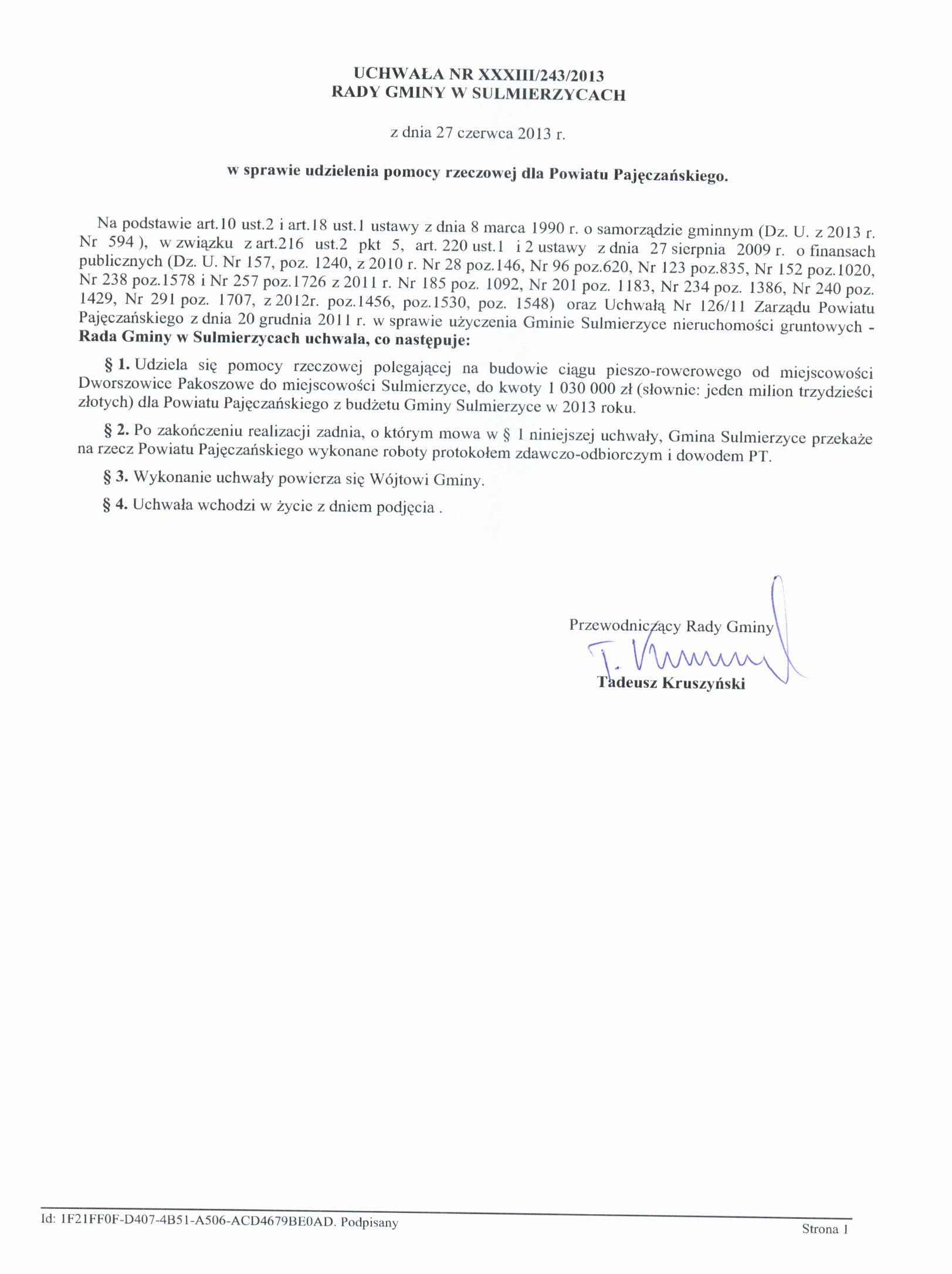 Uchwała Nr XXXIII/243/2013 z dnia 27.06.2013 r. w sprawie udzielenia pomocy rzeczowej dla Powiatu Pajęczańskiego