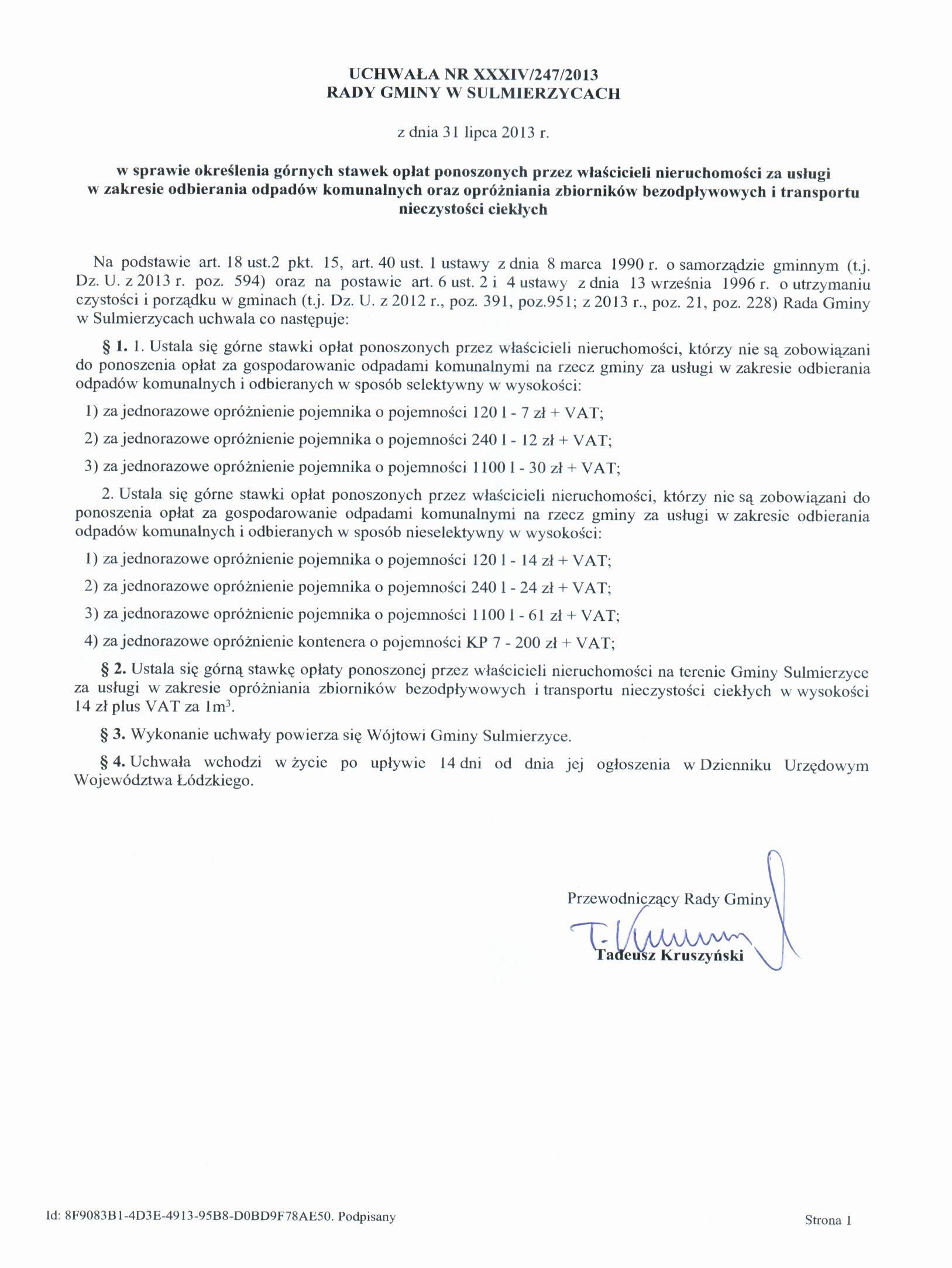 Uchwała Nr XXXIV/247/2013 z dnia 31.07.2013 r. w sprawie określenia górnych stawek opłat ponoszonych przez właścicieli nieruchomości za usługi w zakresie odbierania odpadów komunalnych oraz opróżniania zbiorników bezodpływowych i transport ni