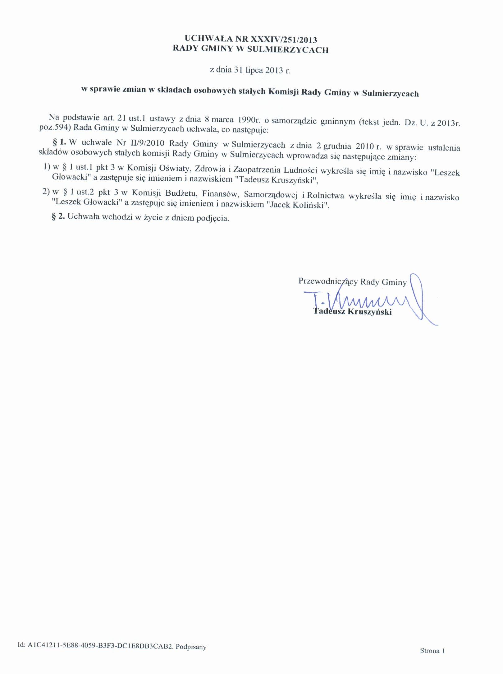 Uchwała Nr XXXIV/251/2013 z dnia 31.07.2013 r. w sprawie zmian w składach osobowych stałych Komisji Rady Gminy w Sulmierzycach