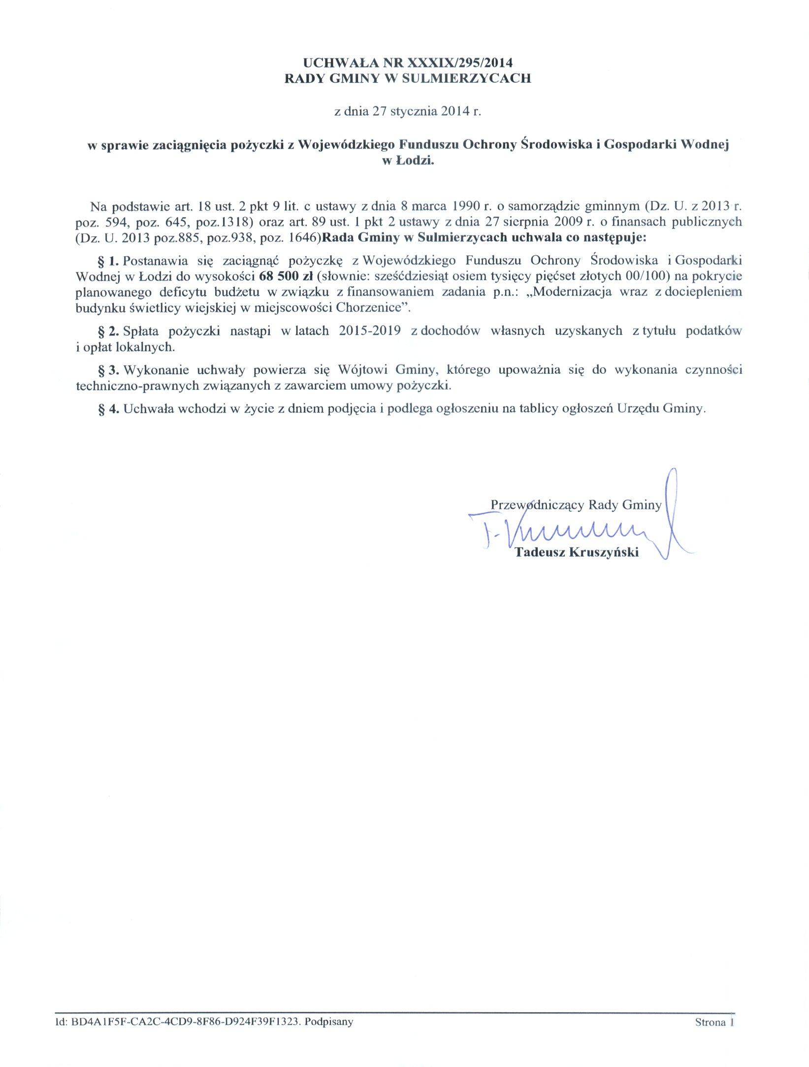 Uchwała Nr XXXIX/295/2014 z dnia 27.01.2014 r. w sprawie zaciągnięcia pożyczki z Wojewódzkiego Funduszu Ochrony Środowiska i Gospodarki Wodnej w Łodzi
