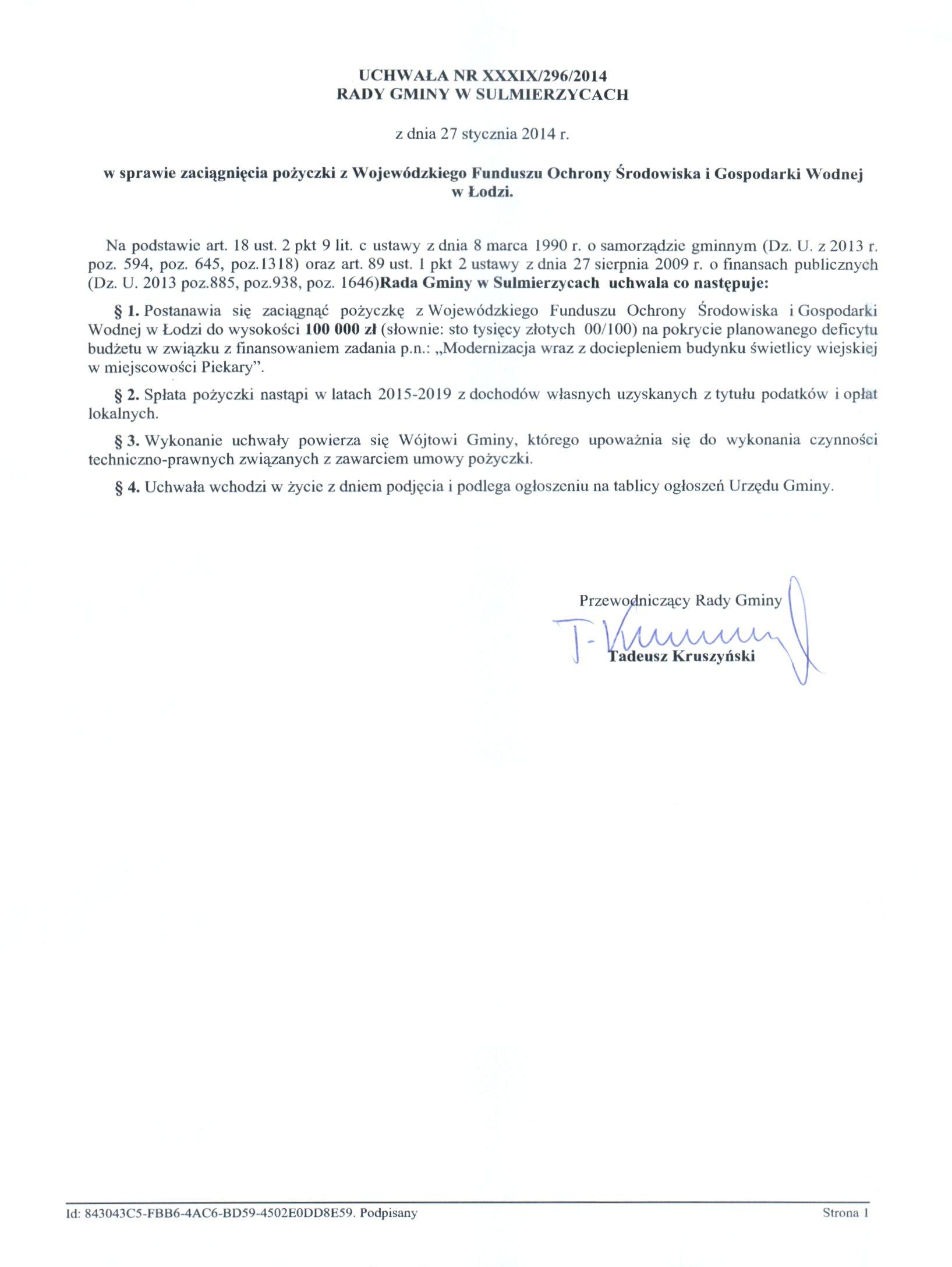 Uchwała Nr XXXIX/296/2014 z dnia 27.01.2014 r. w sprawie zaciągnięcia pożyczki z Wojewódzkiego Funduszu Ochrony Środowiska i Gospodarki Wodnej w Łodzi