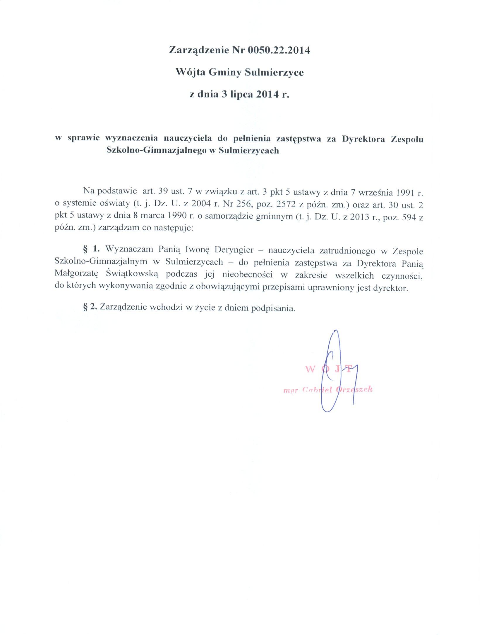 Zarządzenie Nr 0050.22.2014 z dnia 03.07.2014 r. w sprawie wyznaczenia nauczyciela do pełnienia zastępstwa za Dyrektora Zespołu Szkolno-Gimnazjalnego w Sulmierzycach