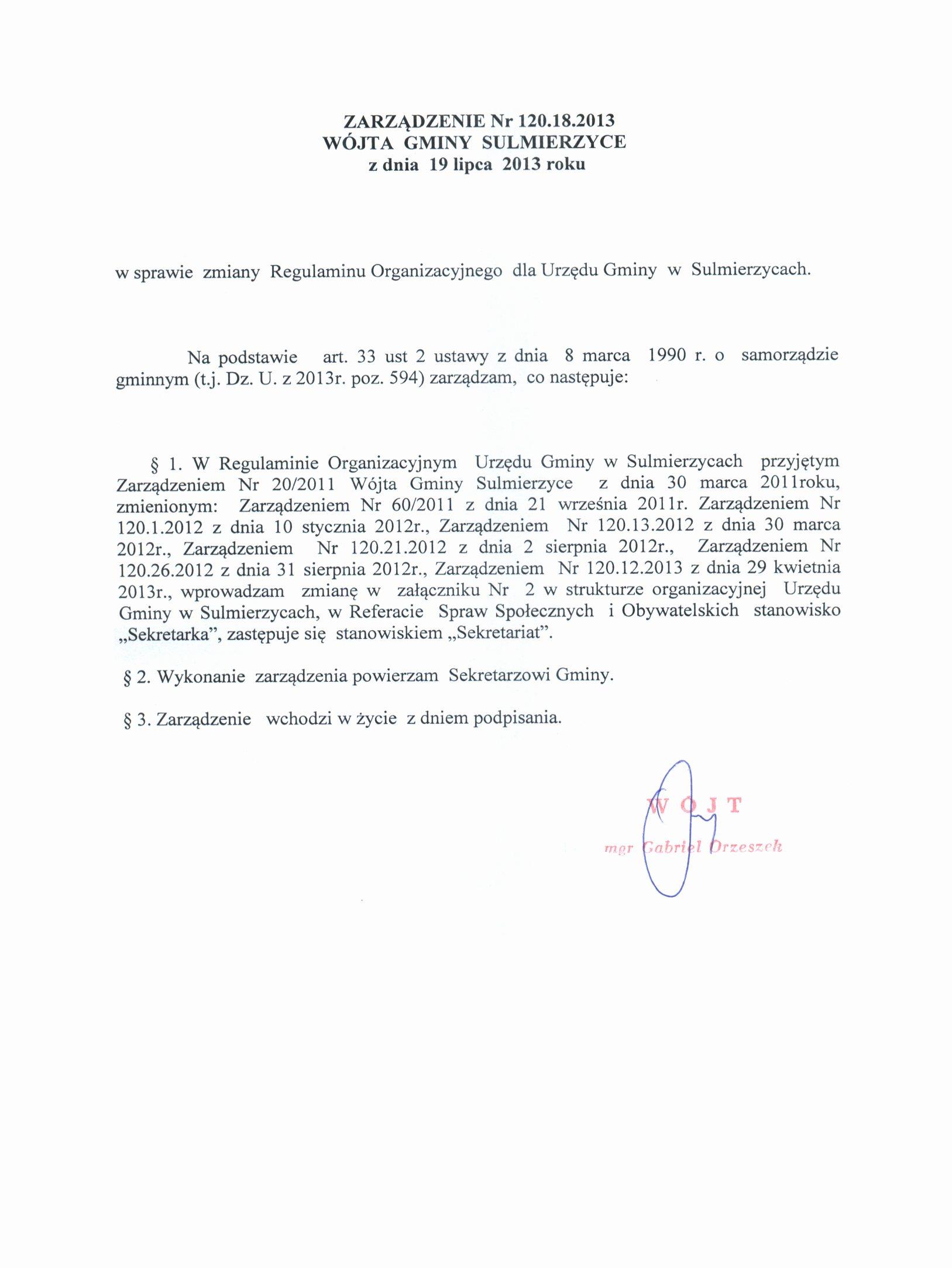 Zarządzenie Nr 120.18.2013 z dnia 19.07.2013 r. w sprawie zmiany Regulaminu Organizacyjnego dla Urzędu Gminy w Sulmierzycach