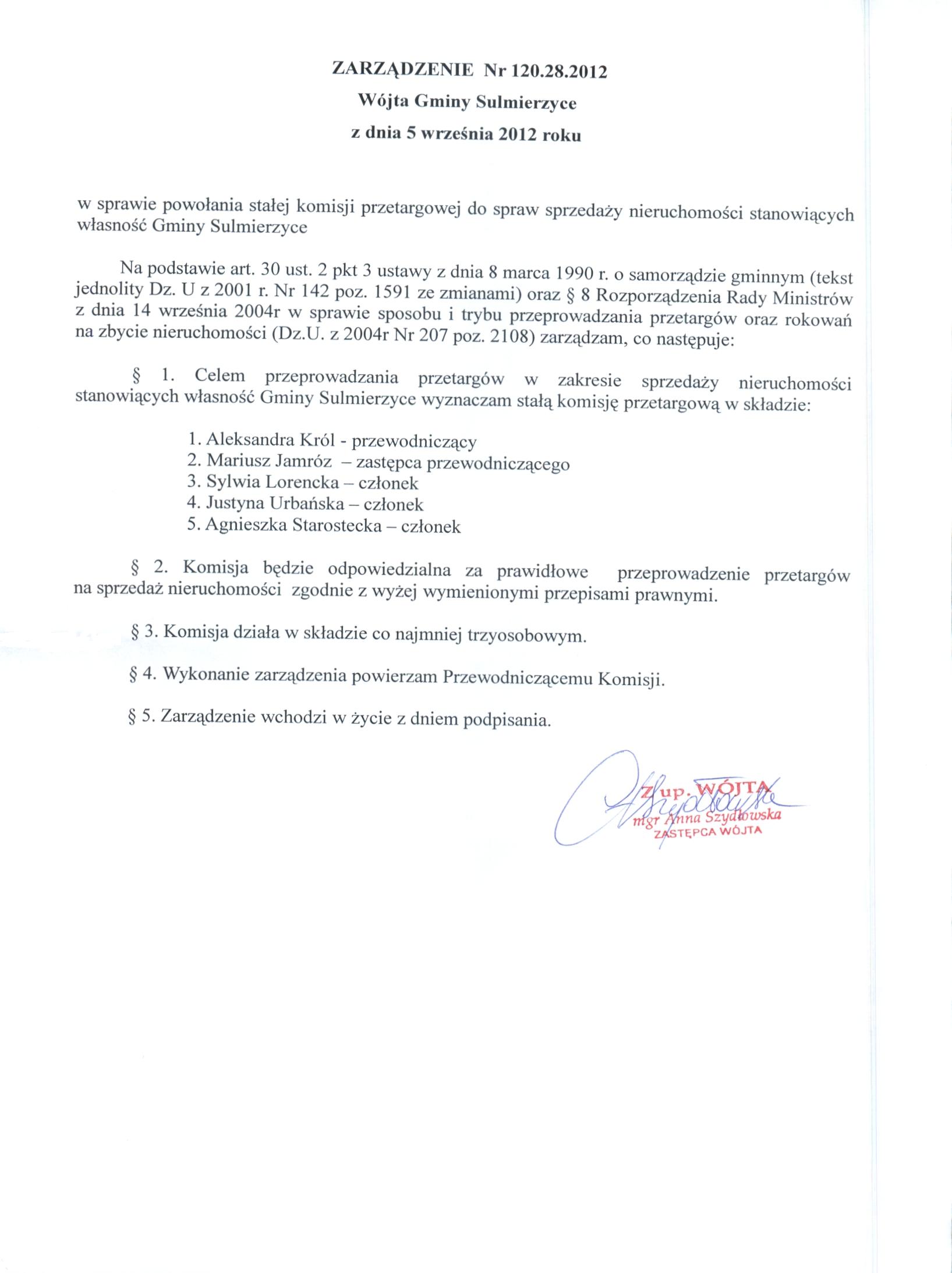 Zarządzenie Nr 120.28.2012 z dnia 05.09.2012 r. w sprawie powołania stałej komisji przetargowej do spraw sprzedaży nieruchomości stanowiących własność Gminy Sulmierzyce