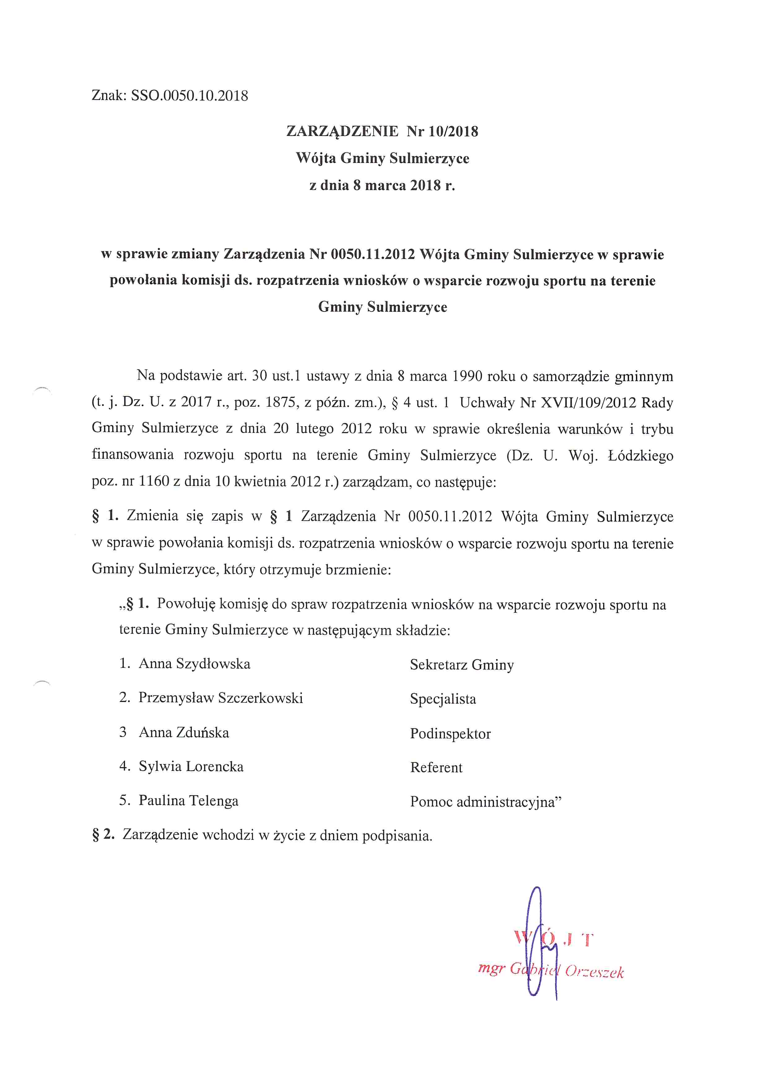 2018-03-08 przez Wójt Gminy Sulmierzyce - Gabriel Orzeszek
