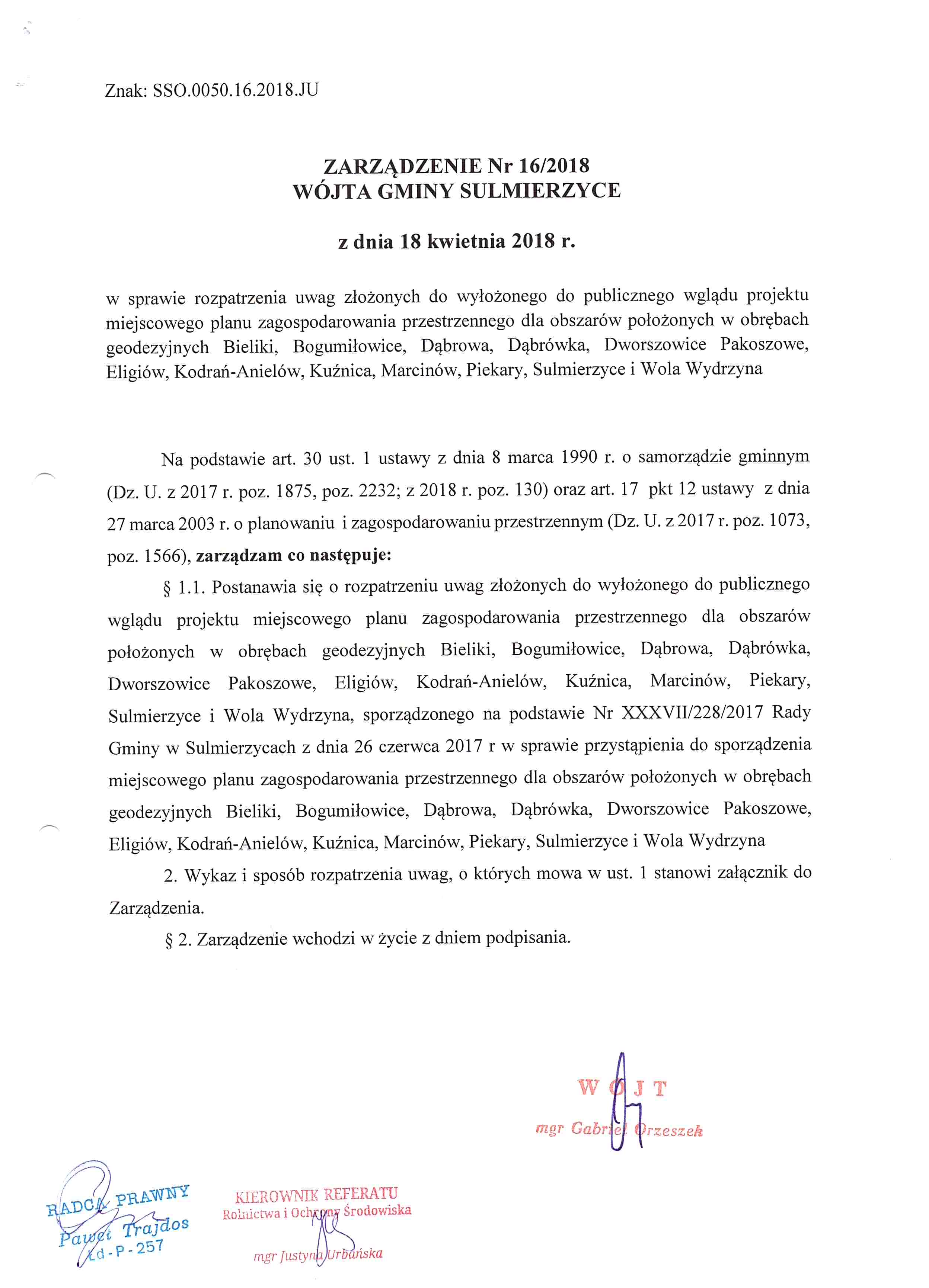 Zarządzenie Nr 16/2018 z dnia 18.04.2018 r. w sprawie rozpatrzenia uwag złożonych do wyłożonego do publicznego wglądu projektu miejscowego planu zagospodarowania przestrzennego