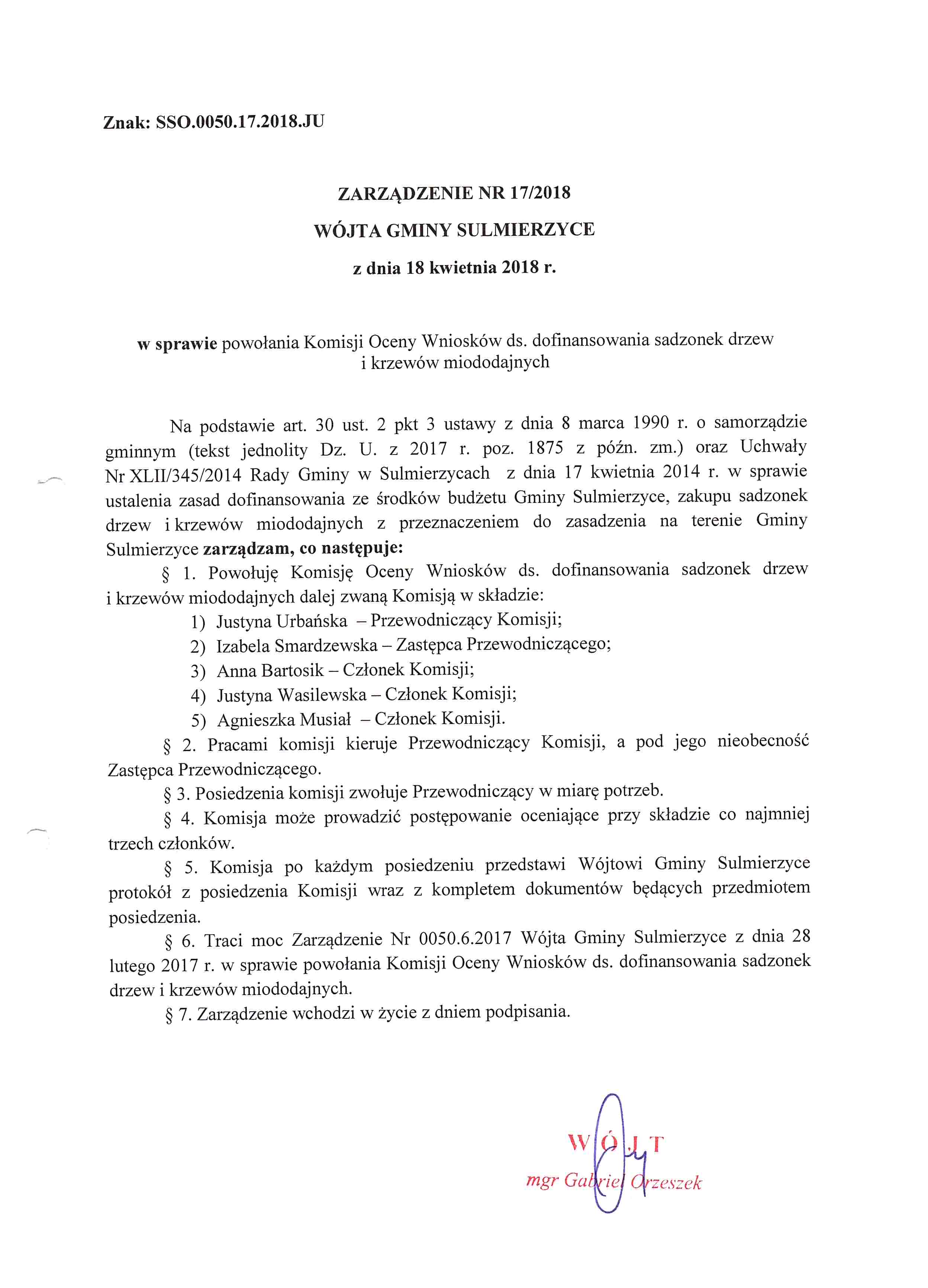 2018-04-18 przez Wójt Gminy Sulmierzyce - Gabriel Orzeszek