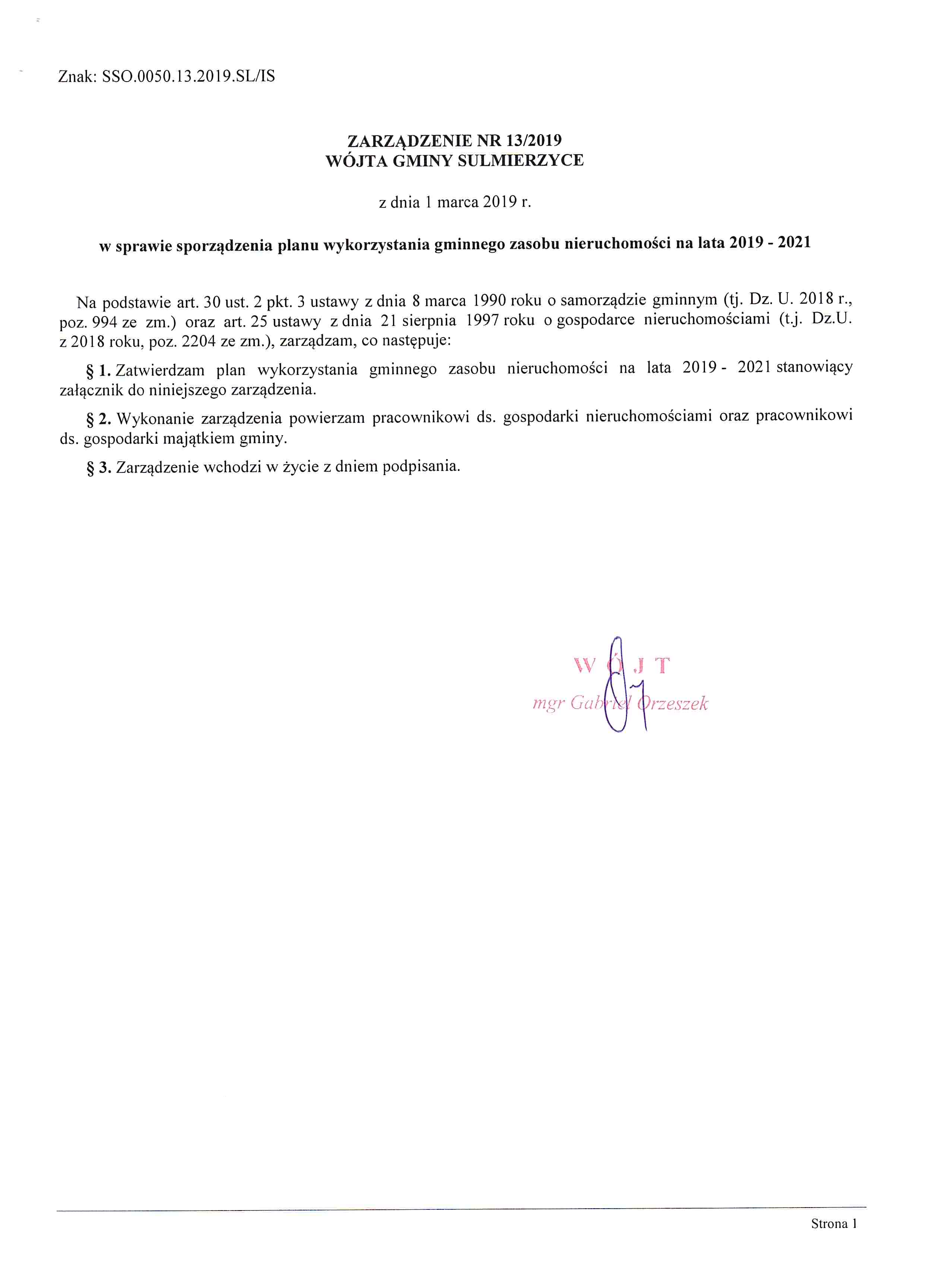 2019-03-01 przez Wójt Gminy Sulmierzyce - Gabriel Orzeszek