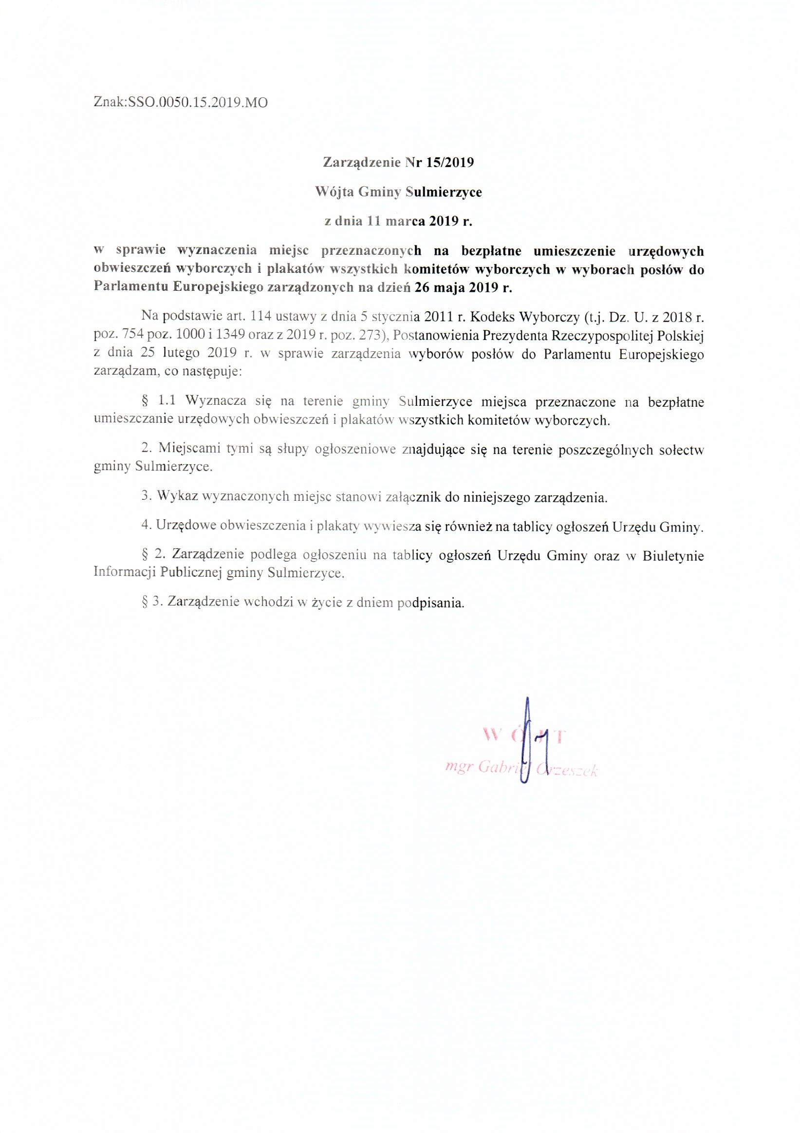 2019-03-11 przez Wójt Gminy Sulmierzyce - Gabriel Orzeszek