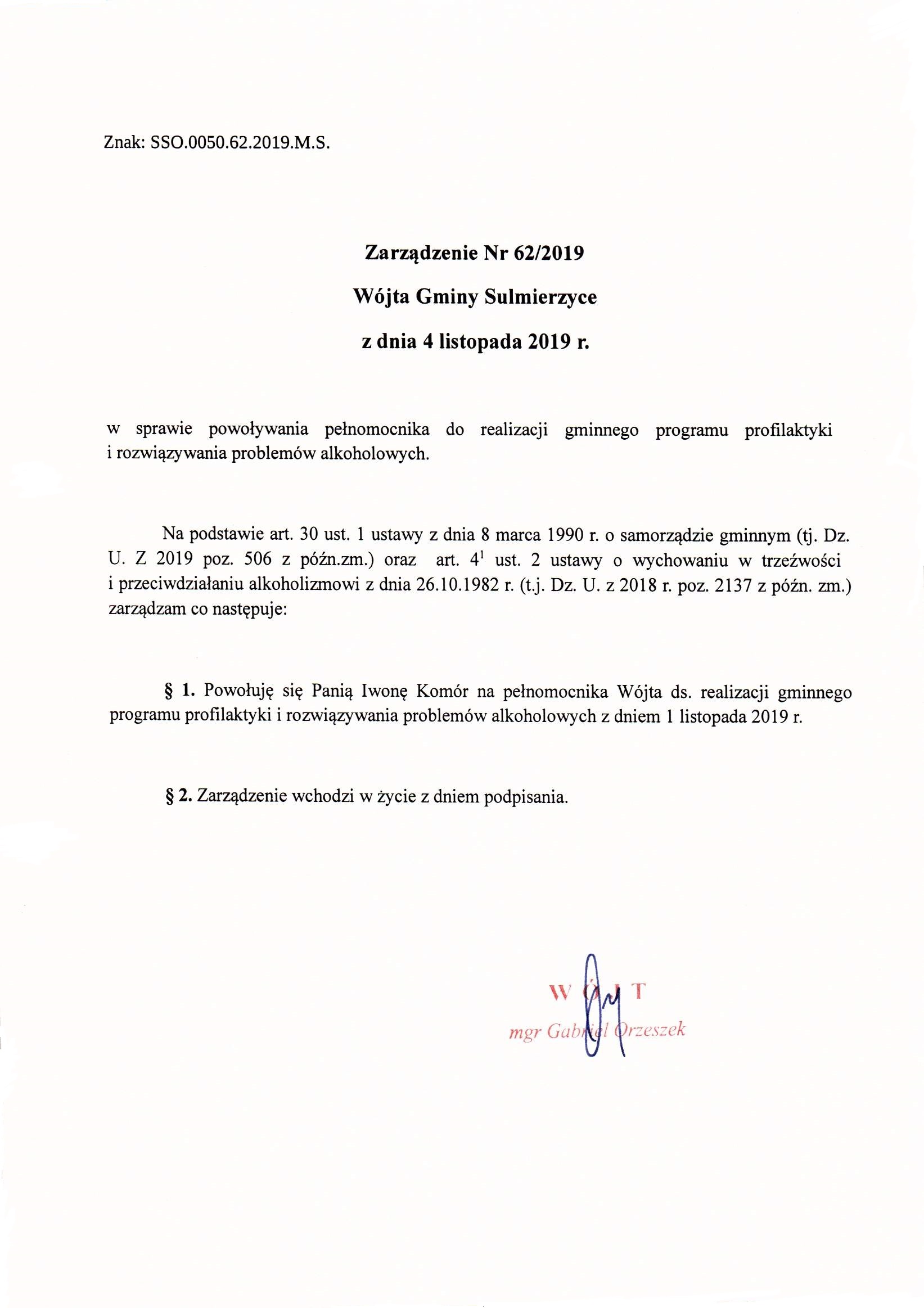 2019-11-04 przez Wójt Gminy Sulmierzyce - Gabriel Orzeszek
