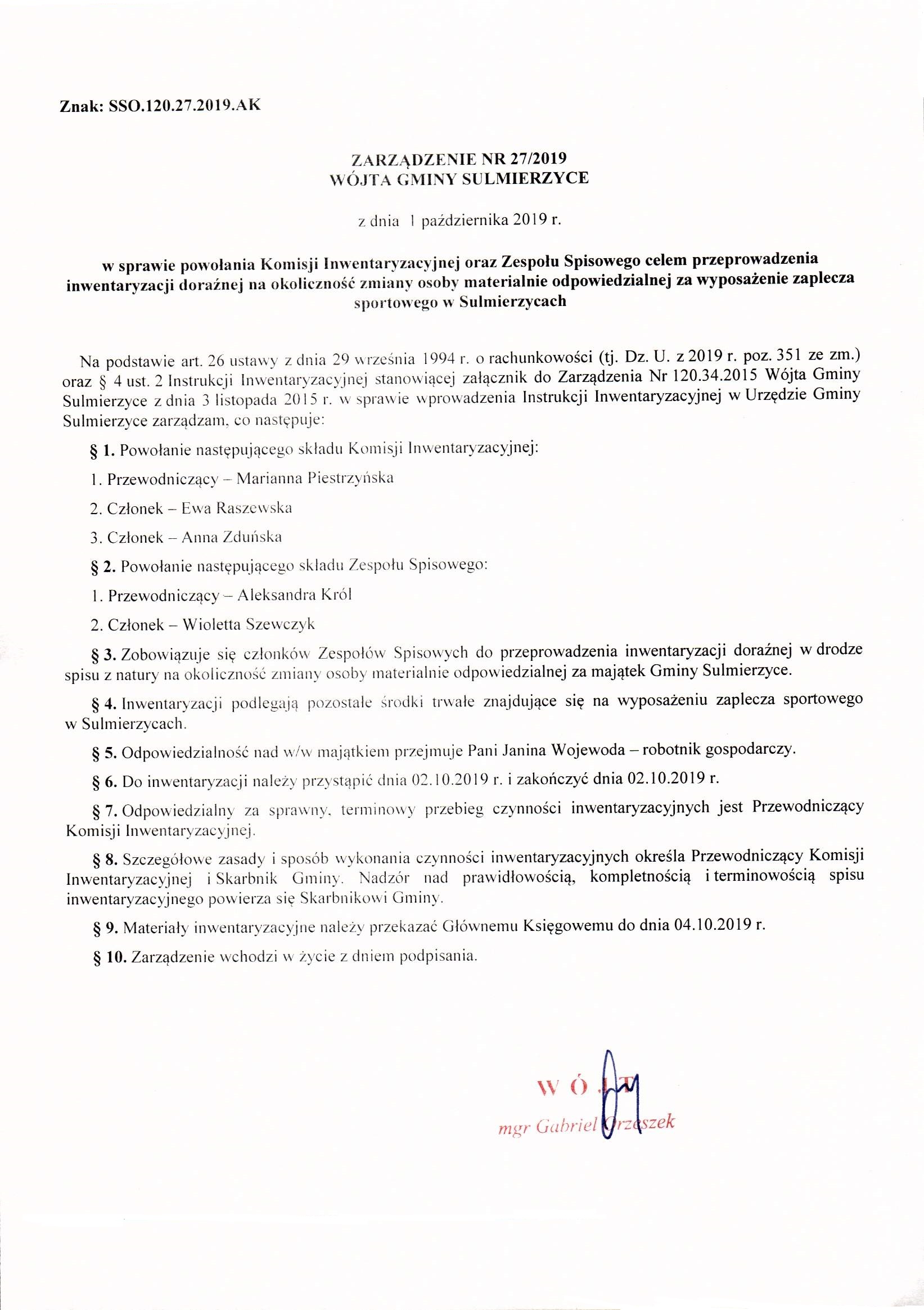 2019-10-01 przez Wójt Gminy Sulmierzyce - Gabriel Orzeszek