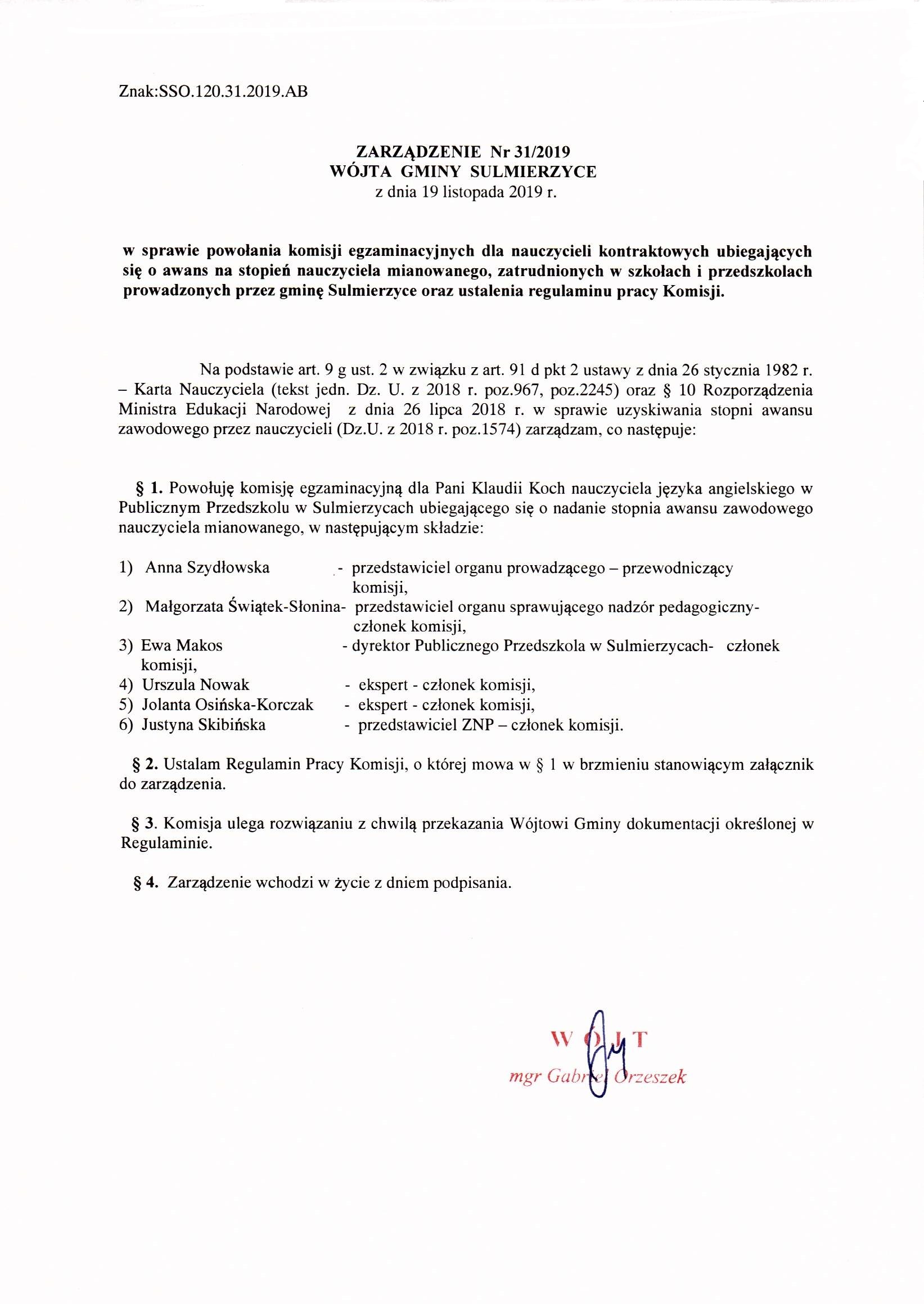 2019-11-19 przez Wójt Gminy Sulmierzyce - Gabriel Orzeszek
