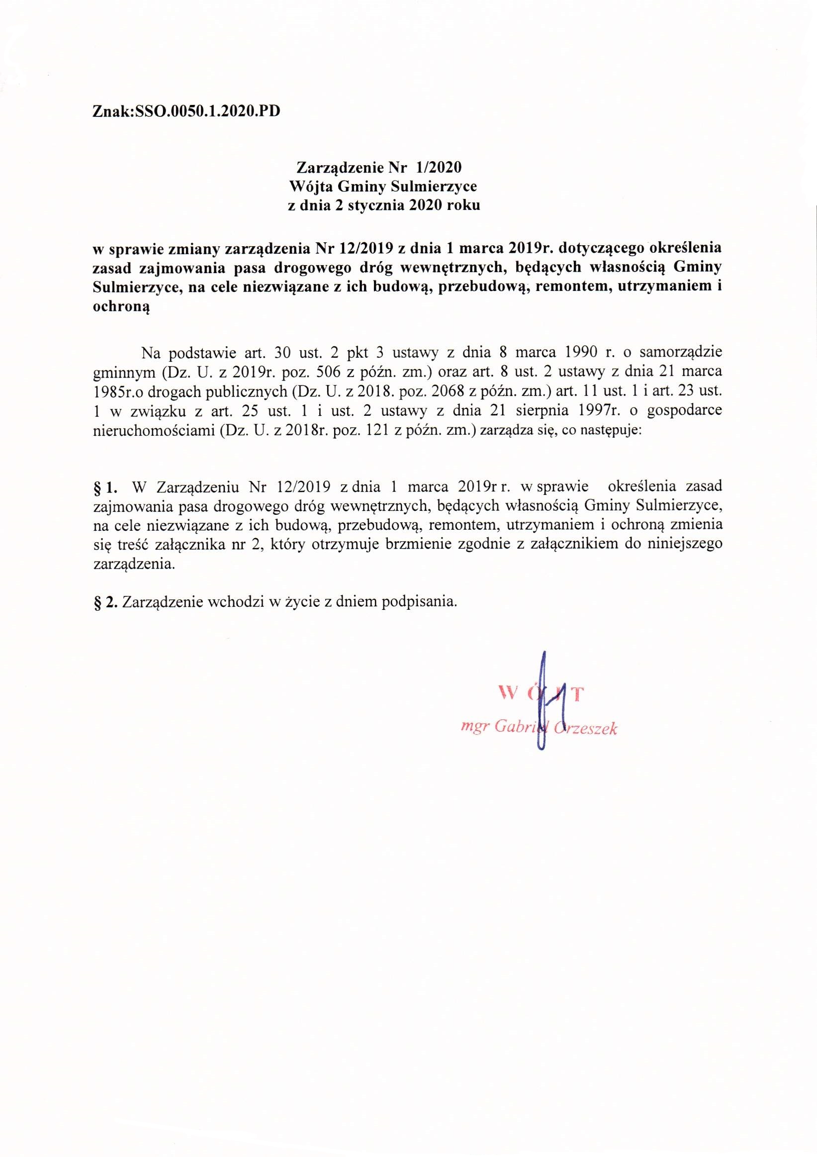 2020-01-02 przez Wójt Gminy Sulmierzyce - Gabriel Orzeszek