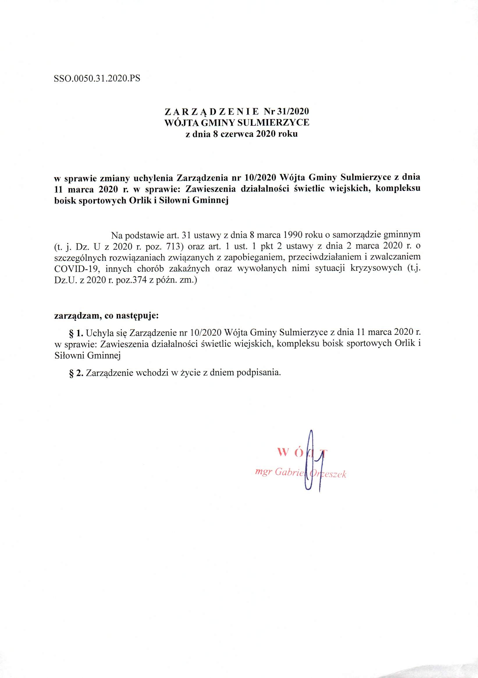 2020-06-08 przez Wójt Gminy Sulmierzyce - Gabriel Orzeszek