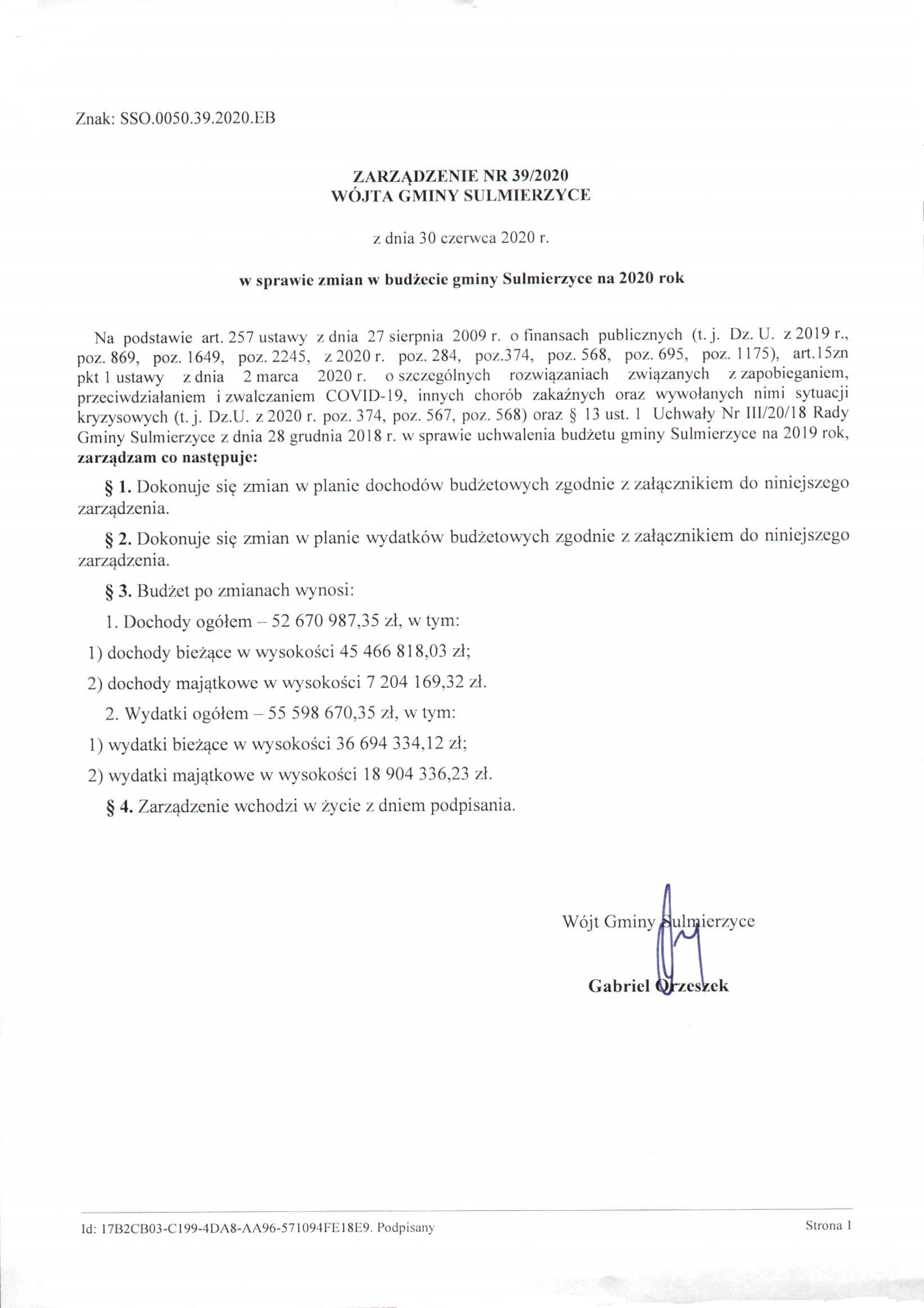 2020-06-30 przez Wójt Gminy Sulmierzyce - Gabriel Orzeszek