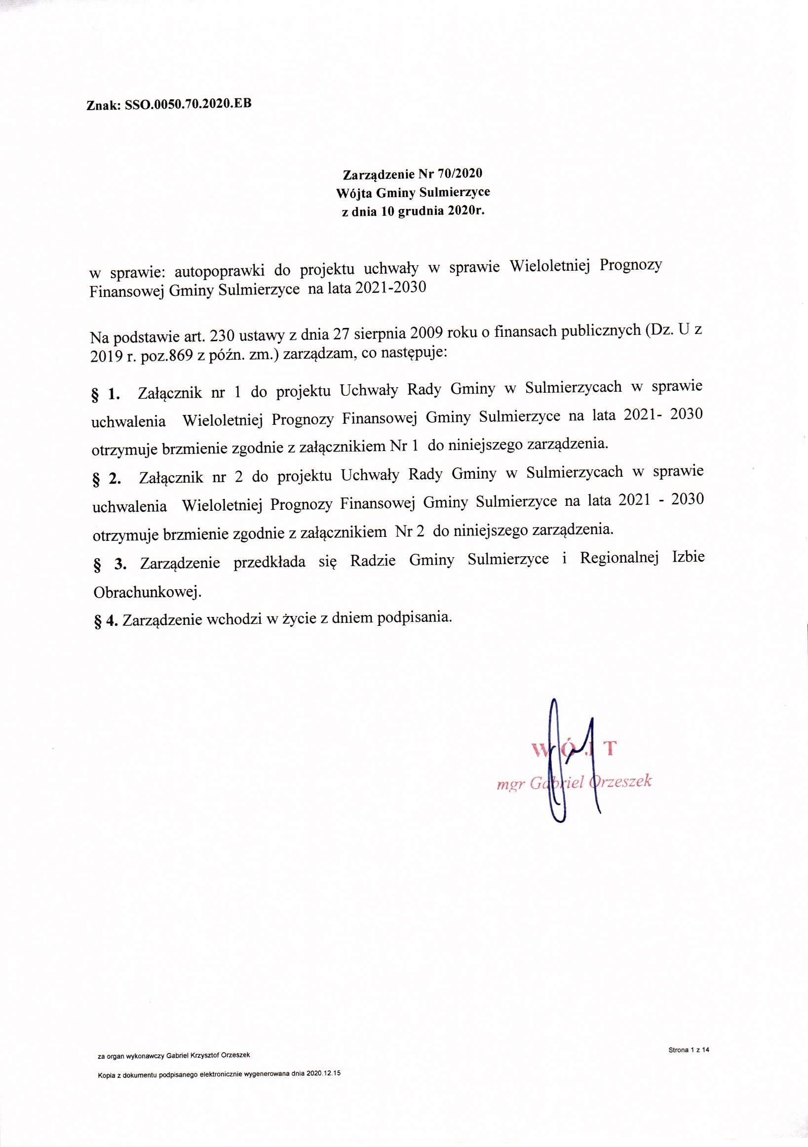 2020-12-10 przez Wójt Gminy Sulmierzyce - Gabriel Orzeszek