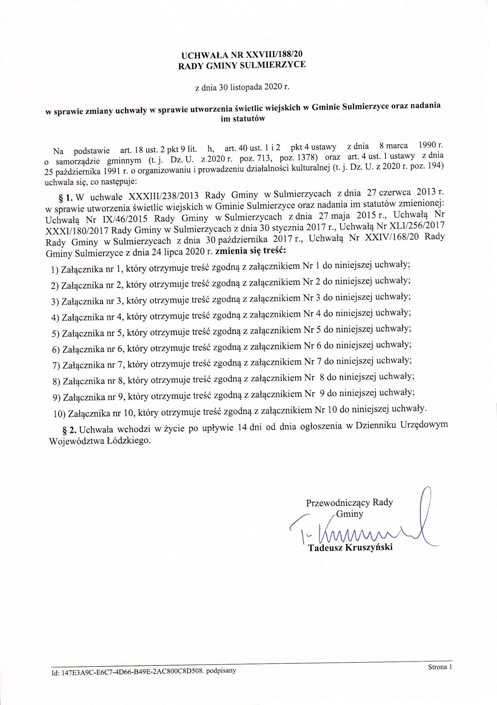 Uchwała Nr XXVIII/188/20 w sprawie zmiany uchwały w sprawie utworzenia świetlic wiejskich w Gminie Sulmierzyce oraz nadania im statutów