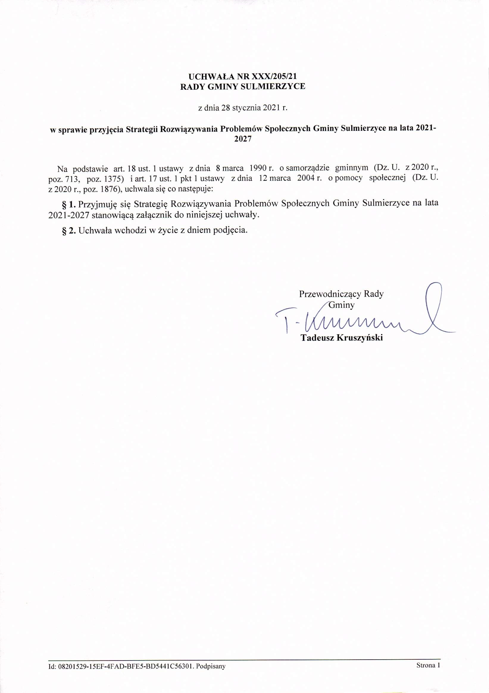Uchwała Nr XXX/205/21 w sprawie przyjęcia Strategii Rozwiązywania Problemów Społecznych Gminy Sulmierzyce na lata 2021 - 2027