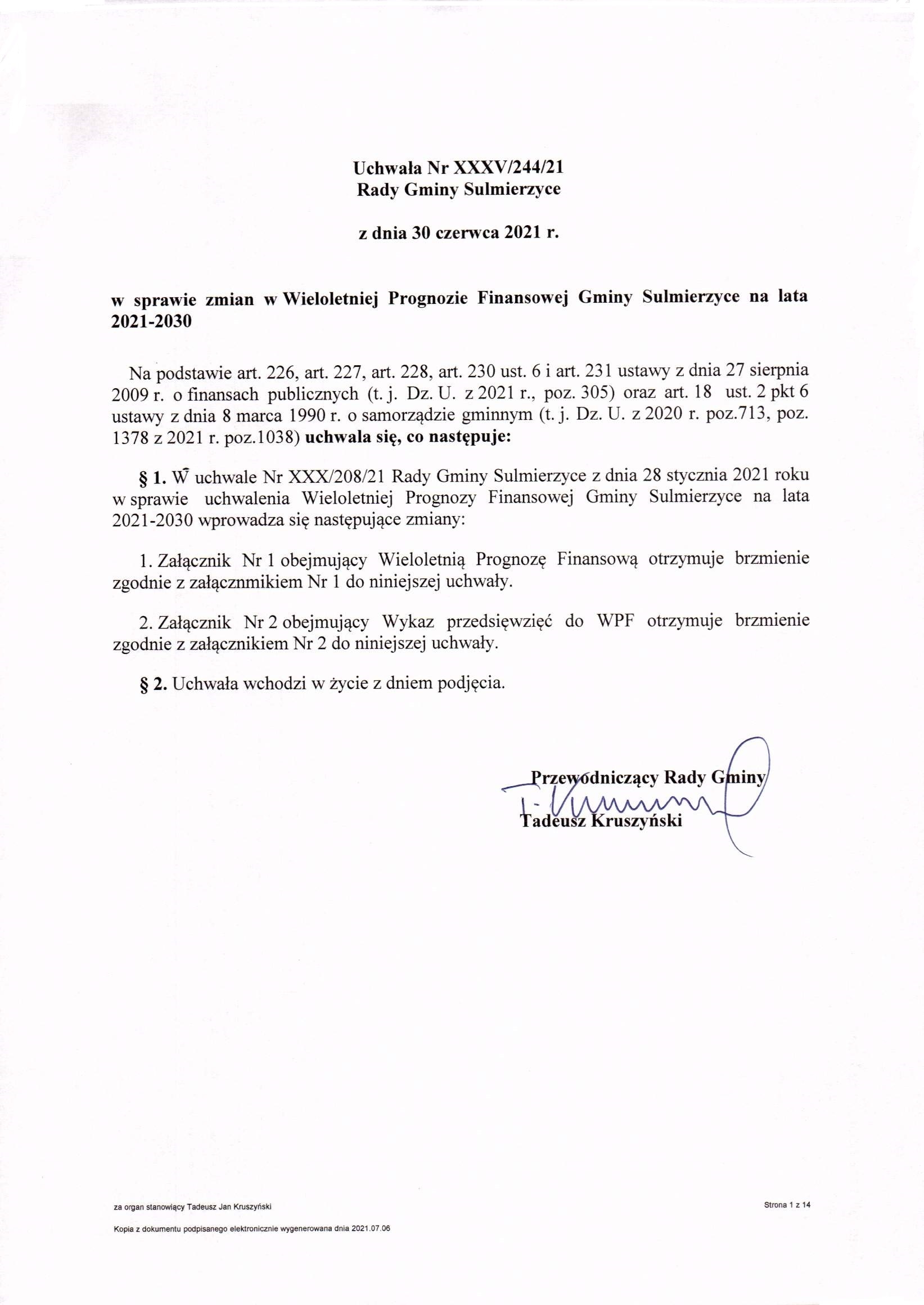 2021-06-30 przez Tadeusz Kruszyński - Przewodniczący Rady Gminy Sulmierzyce