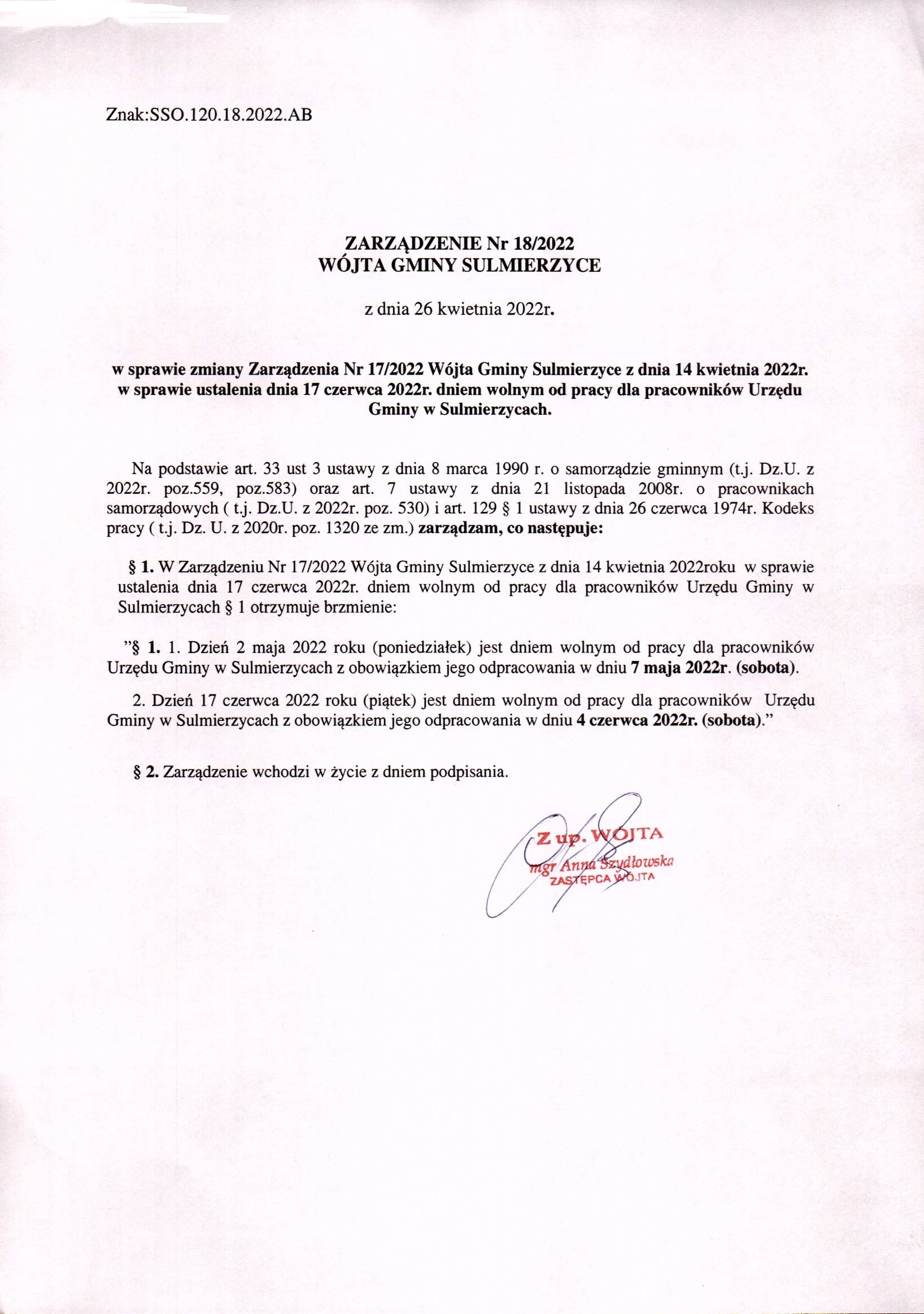 2022-04-26 przez Anna Bujacz, zatwierdził: Zastępca Wójta Gminy Anna Szydłowska