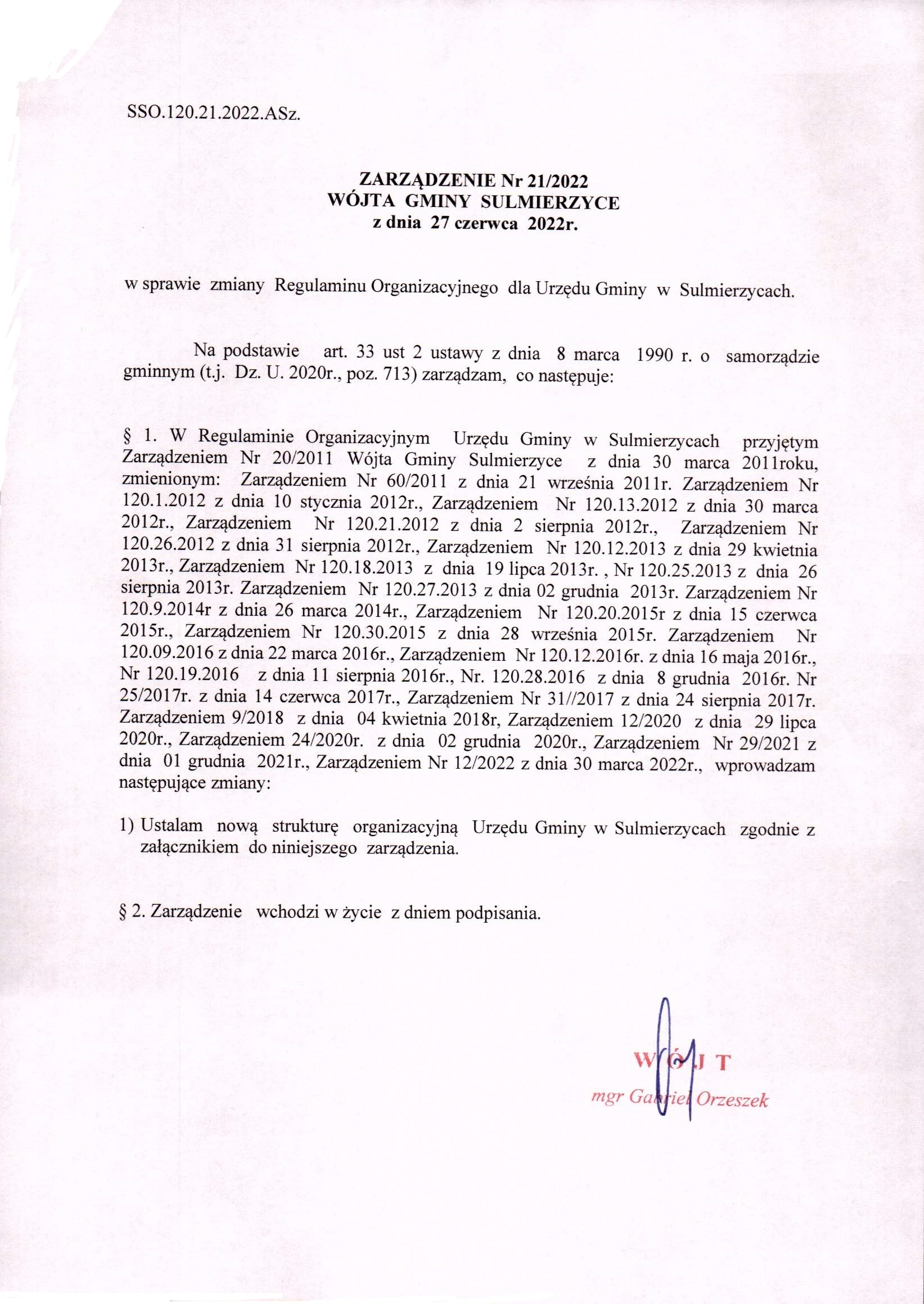 2022-06-27 przez Anna Szydłowska, zatwierdził: Wójt Gminy Gabriel Orzeszek