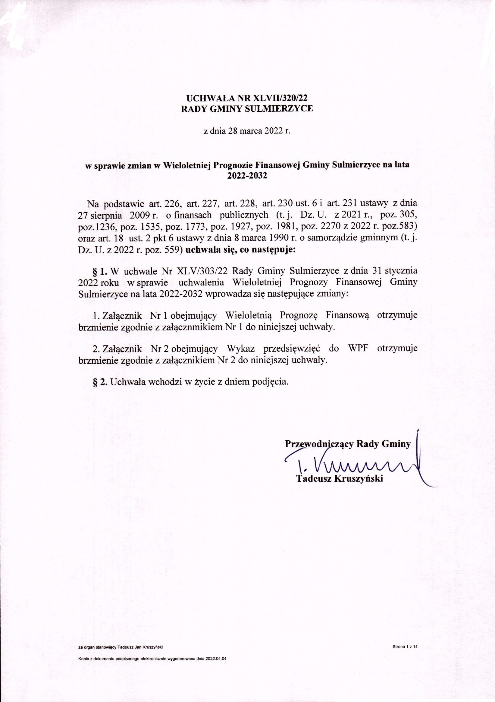 2022-03-28 przez Tadeusz Kruszyński - Przewodniczący Rady Gminy Sulmierzyce