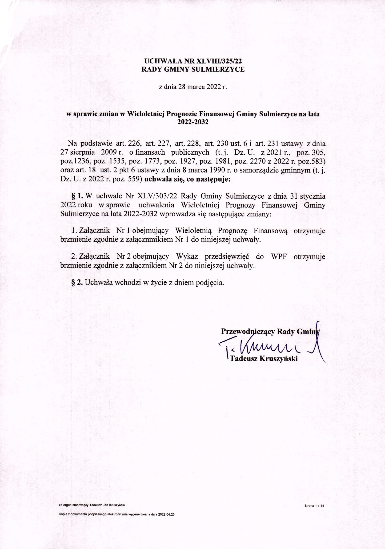 2022-04-13 przez Tadeusz Kruszyński - Przewodniczący Rady Gminy Sulmierzyce