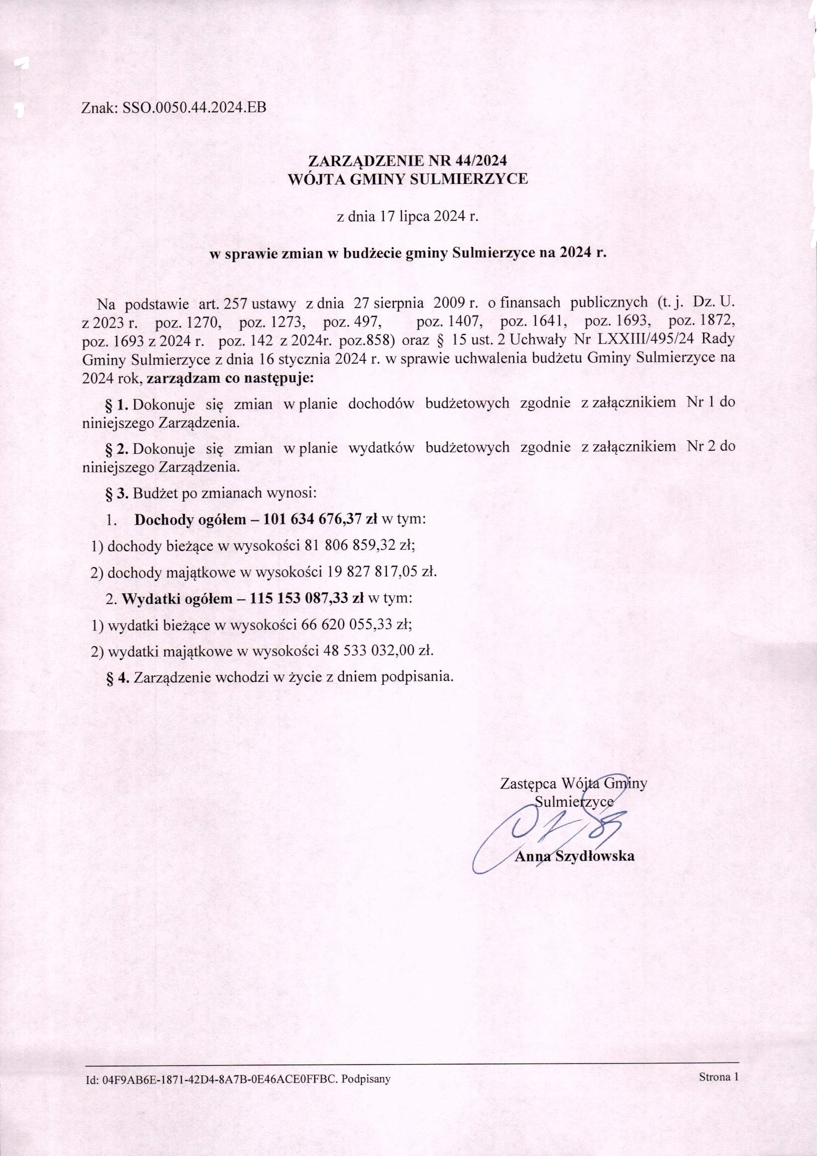 2024-07-17 przez Skarbnik Gminy Ewa Bęczkowska, zatwierdził: Zastępca Wójta Gminy Anna Szydłowska