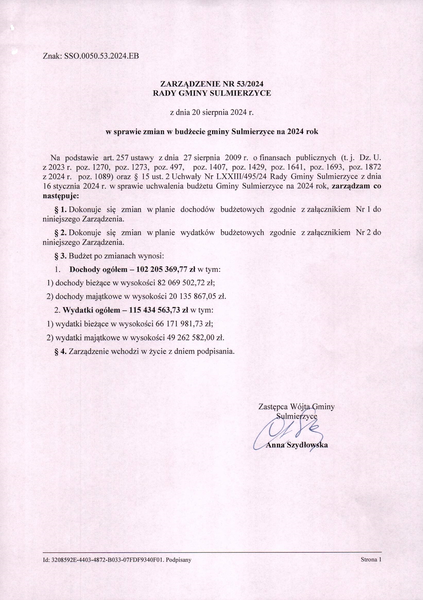 2024-08-20 przez Skarbnik Gminy Ewa Bęczkowska, zatwierdził: Zastępca Wójta Gminy Anna Szydłowska