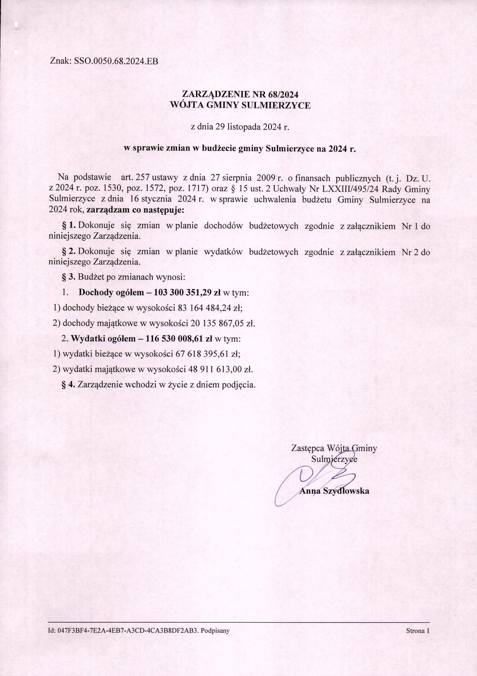2024-11-29 przez Skarbnik Gminy Ewa Bęczkowska, zatwierdził: Zastępca Wójta Gminy Anna Szydłowska