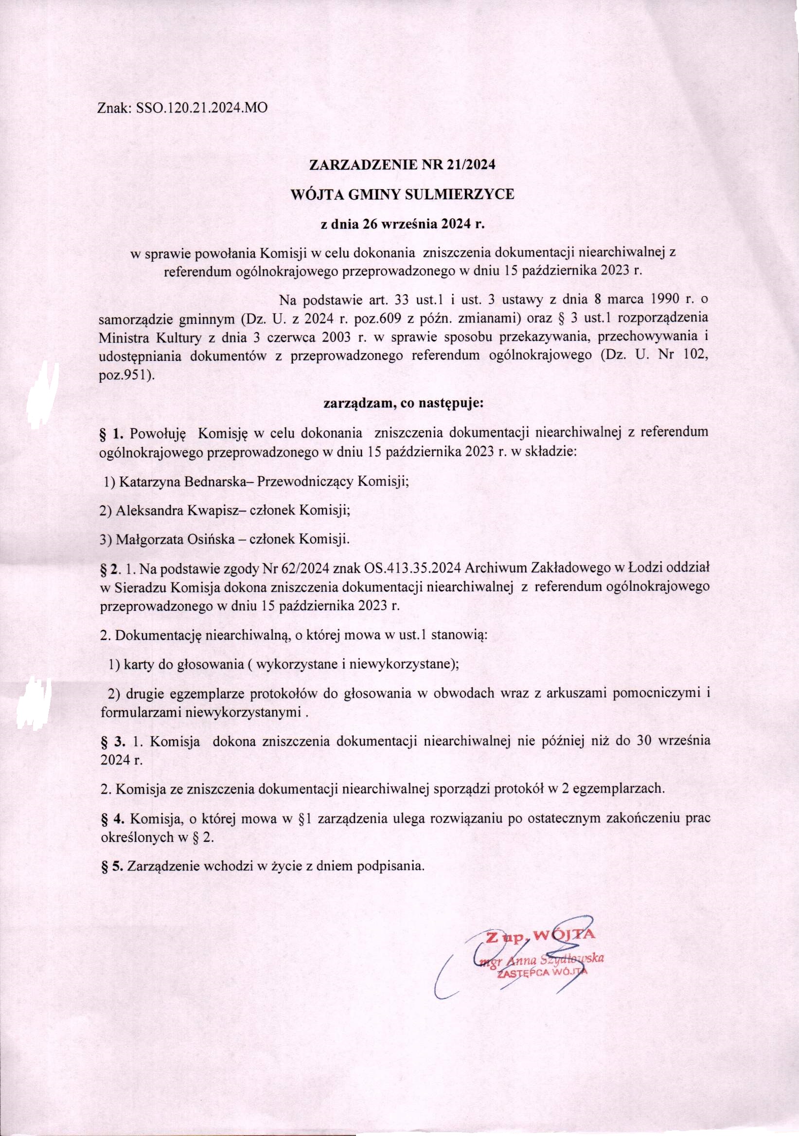 2024-09-26 przez Małgorzata Osińska, zatwierdził: Zastępca Wójta Gminy Anna Szydłowska