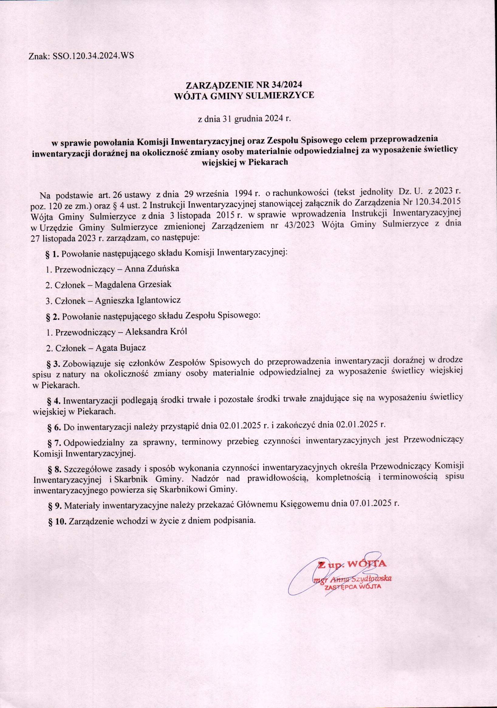 2024-12-31 przez Wioletta Szewczyk, zatwierdził: Zastępca Wójta Gminy Anna Szydłowska