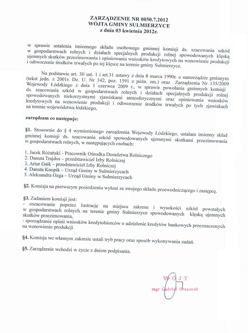 Zarządzenie nr 0050.7.2012 w sprawie ustalenia imiennego składu osobowego gminnej komisji ds. szacowania szkód w gospodarstwach rolnych i działach specjalnych produkcji rolnej spowodowanych klęską ujemnych skutków przezimowania i opiniowania wniosk