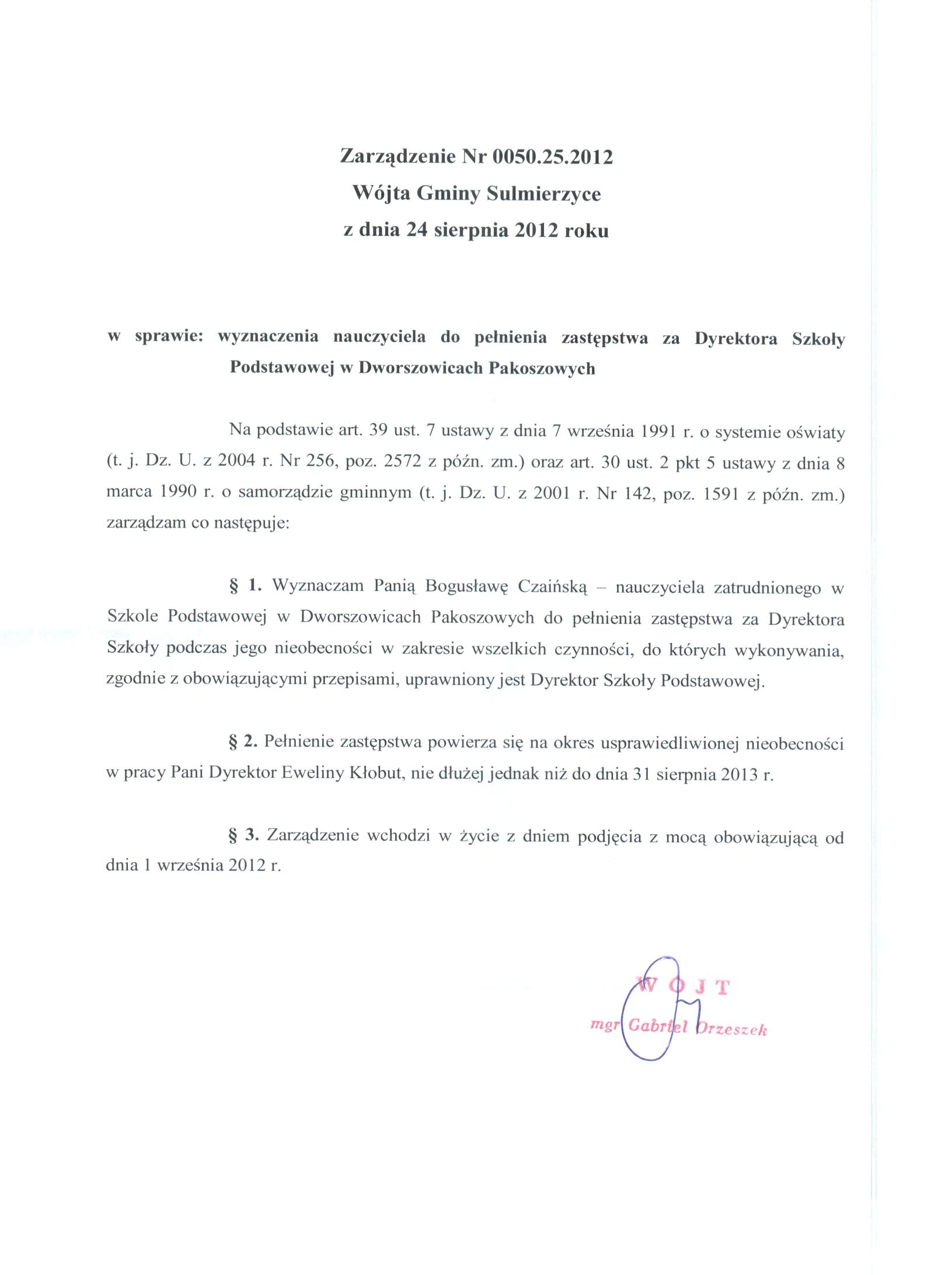 Zarządzenie Nr 0050.25.2012 z dnia 24.08.2012 r. w sprawie wyznaczenia nauczyciela do pełnienia zastępstwa za Dyrektora Szkoły Podstawowej w Dworszowicach Pakoszowych