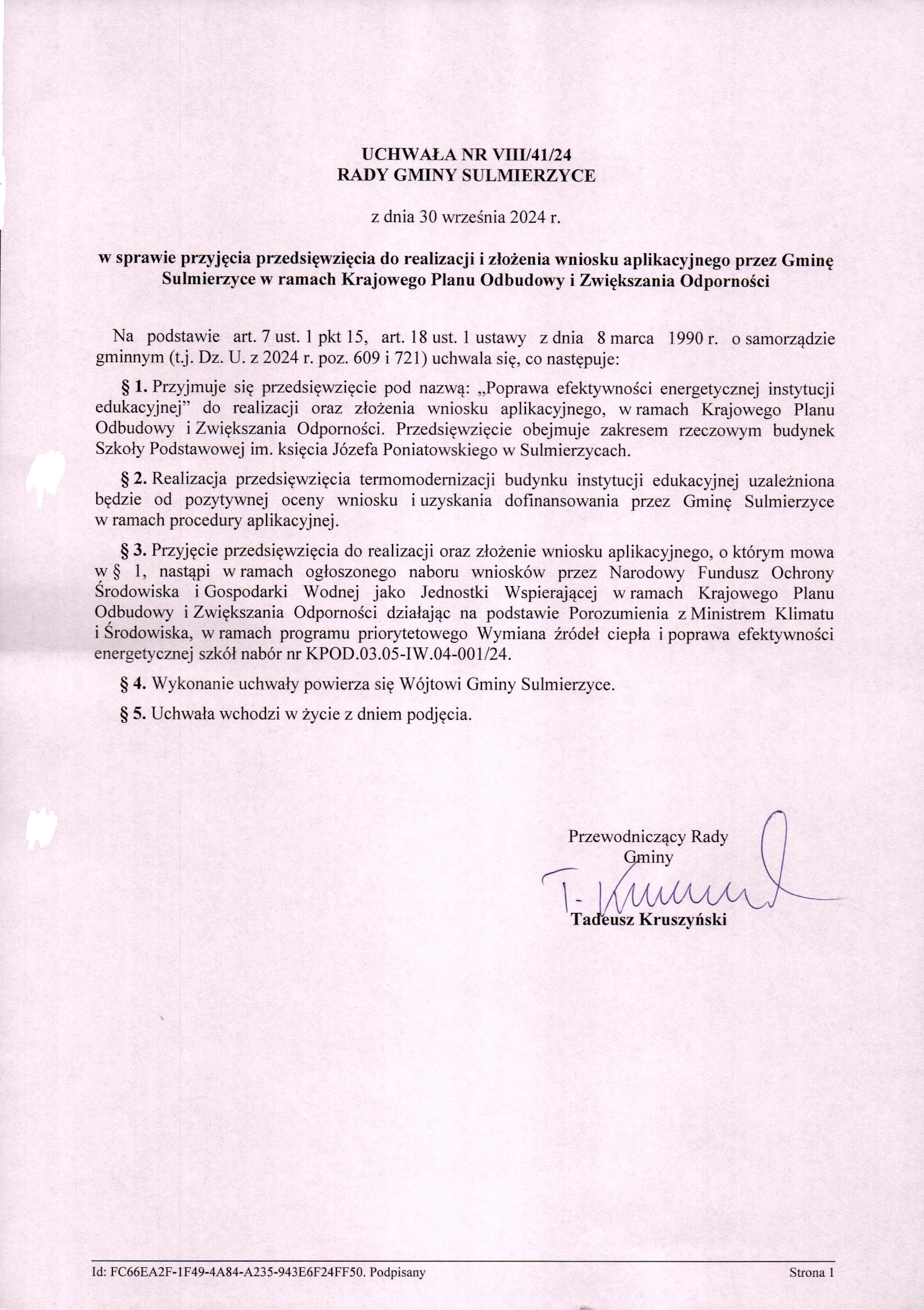2024-09-30 przez Tadeusz Kruszyński - Przewodniczący Rady Gminy Sulmierzyce