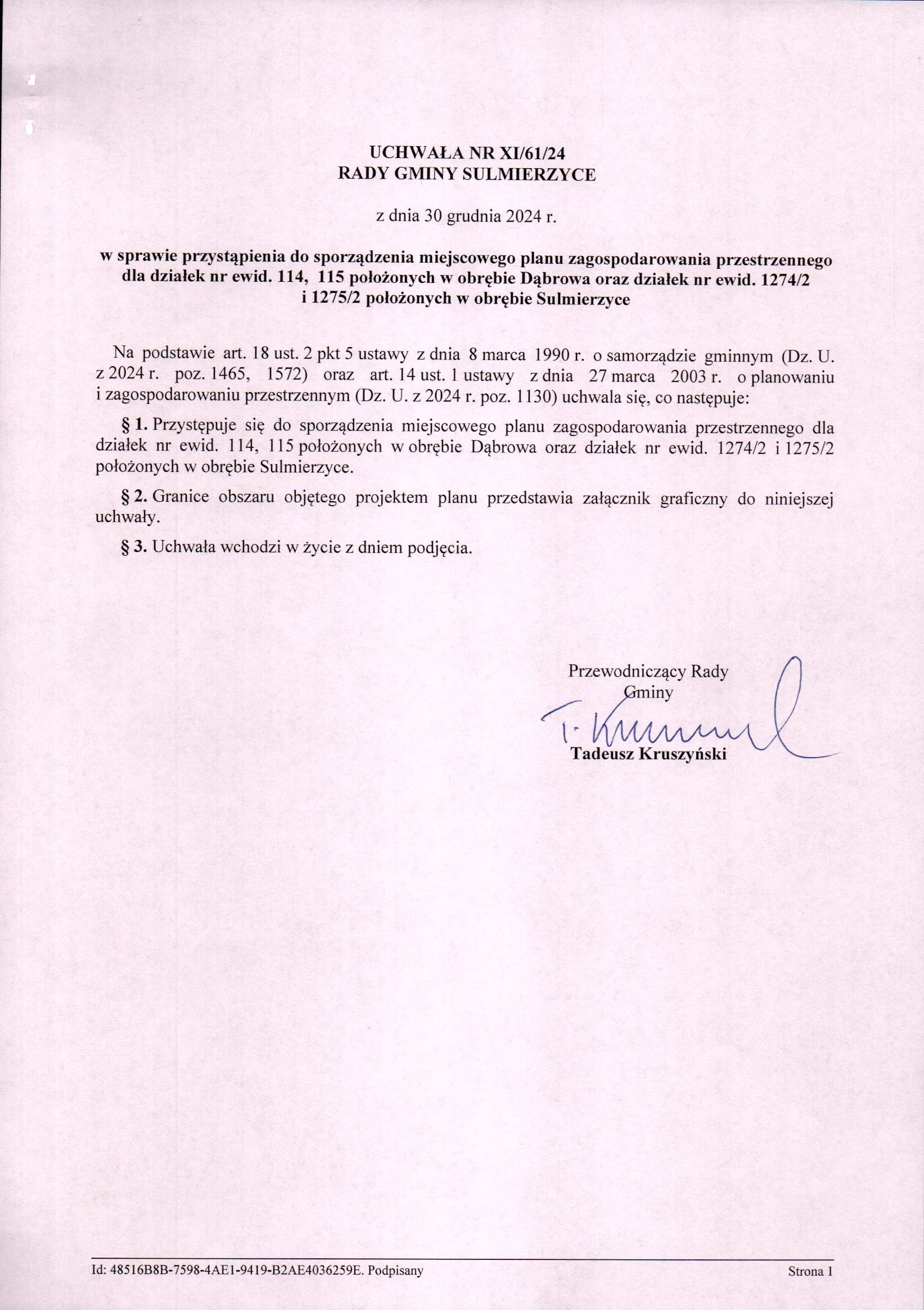 Uchwała Nr XI/61/24 ws. przystąpienia do sporządzenia miejscowego planu zagospodarowania przestrzennego dla działek nr ewid. 114, 115 położonych w obrębie Dąbrowa oraz działek nr ewid. 1274/2 i 1275/2 położonych w obrębie Sulmierzyce